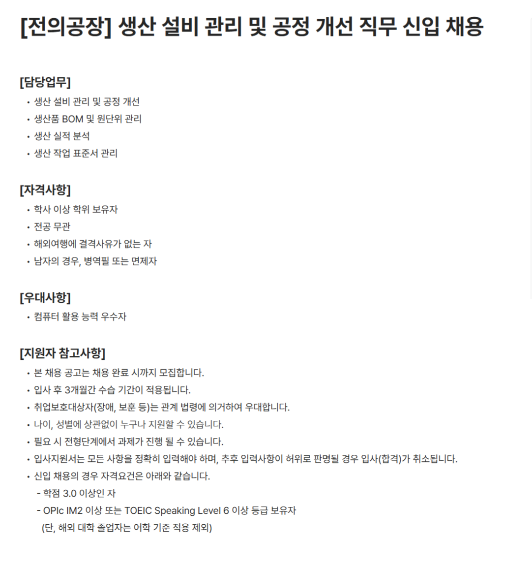 전의공장 생산 효율 극대화를 위한 설비 관리 및 공정 최적화 인재 채용