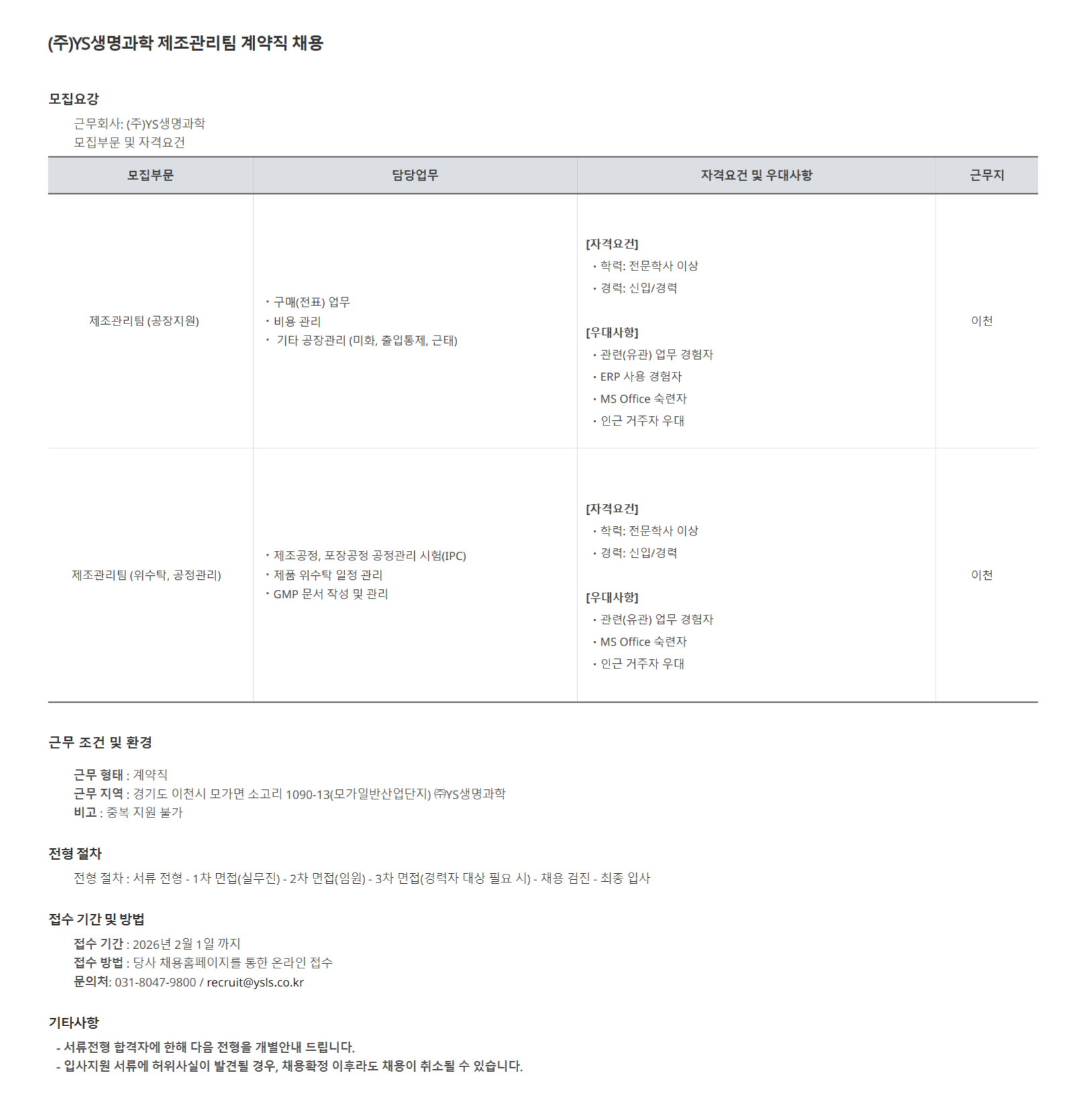 생명과학의 가치를 더하는 YS생명과학에서 제조관리 전문가를 모십니다.