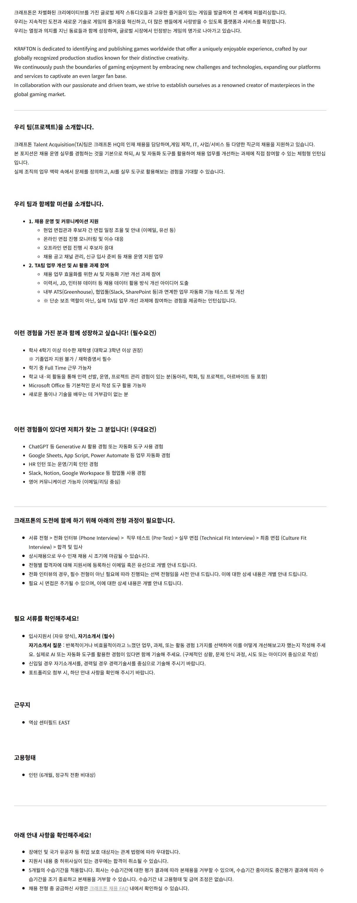 ※ 단순 보조 역할이 아닌, 실제 TA팀 업무 개선 과제에 참여하는 경험을 제공하는 인턴십입니다.