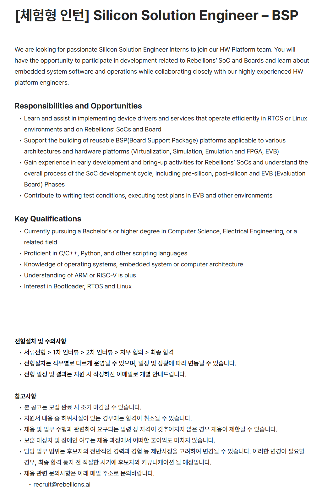 [리벨리온] [체험형 인턴] Silicon Solution Engineer – BSP