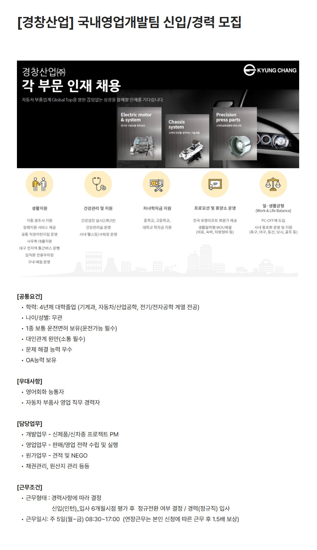 - 학력: 4년제 대학졸업 (기계과, 자동차/산업공학, 전기/전자공학 계열 전공)