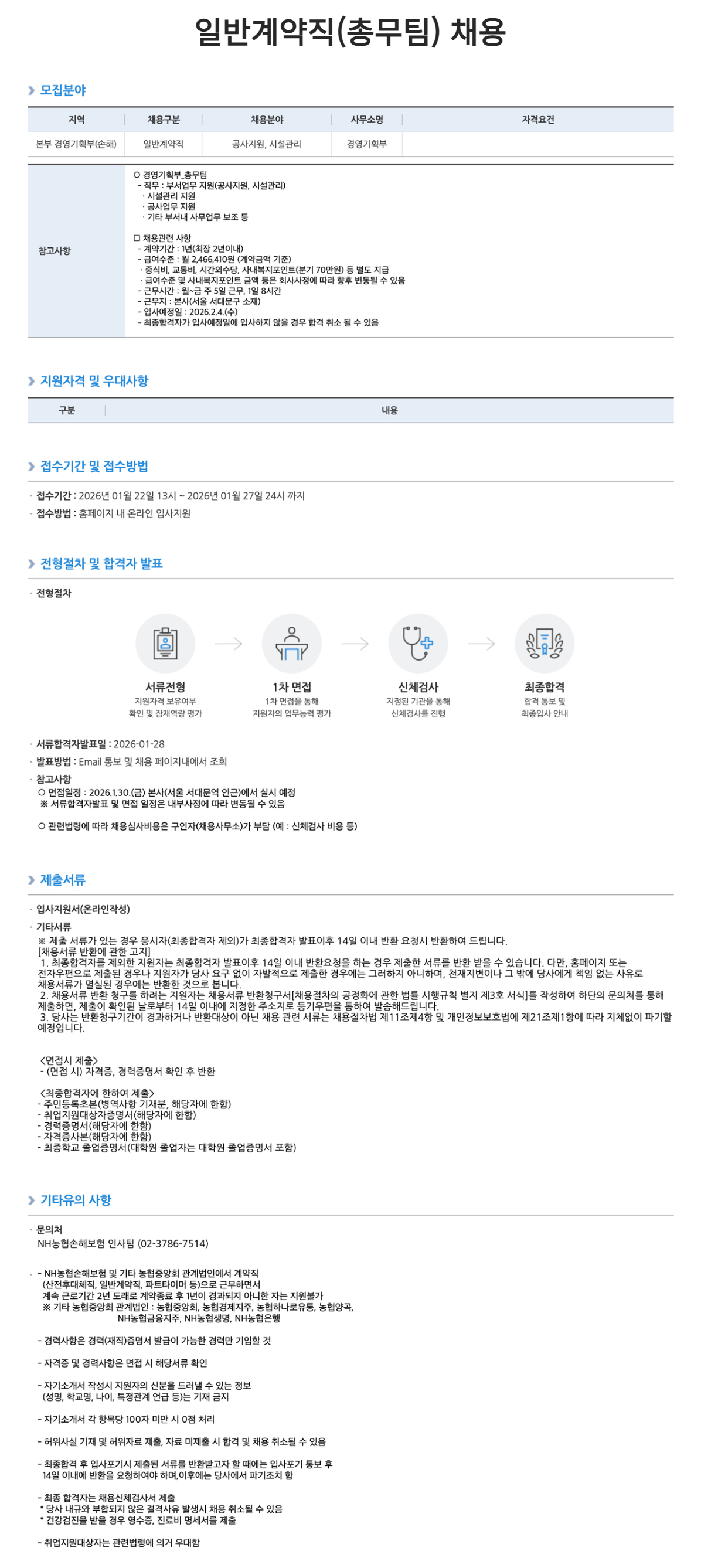 [NH농협손해보험] 일반계약직 채용 공고 (총무팀) (~01/27)