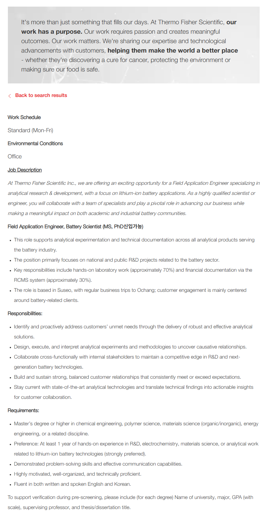 - 리튬이온 배터리 기술과 관련된 R&D, 전기화학, 재료과학, 분석 업무 경험 1년 이상 (강력 우대)
