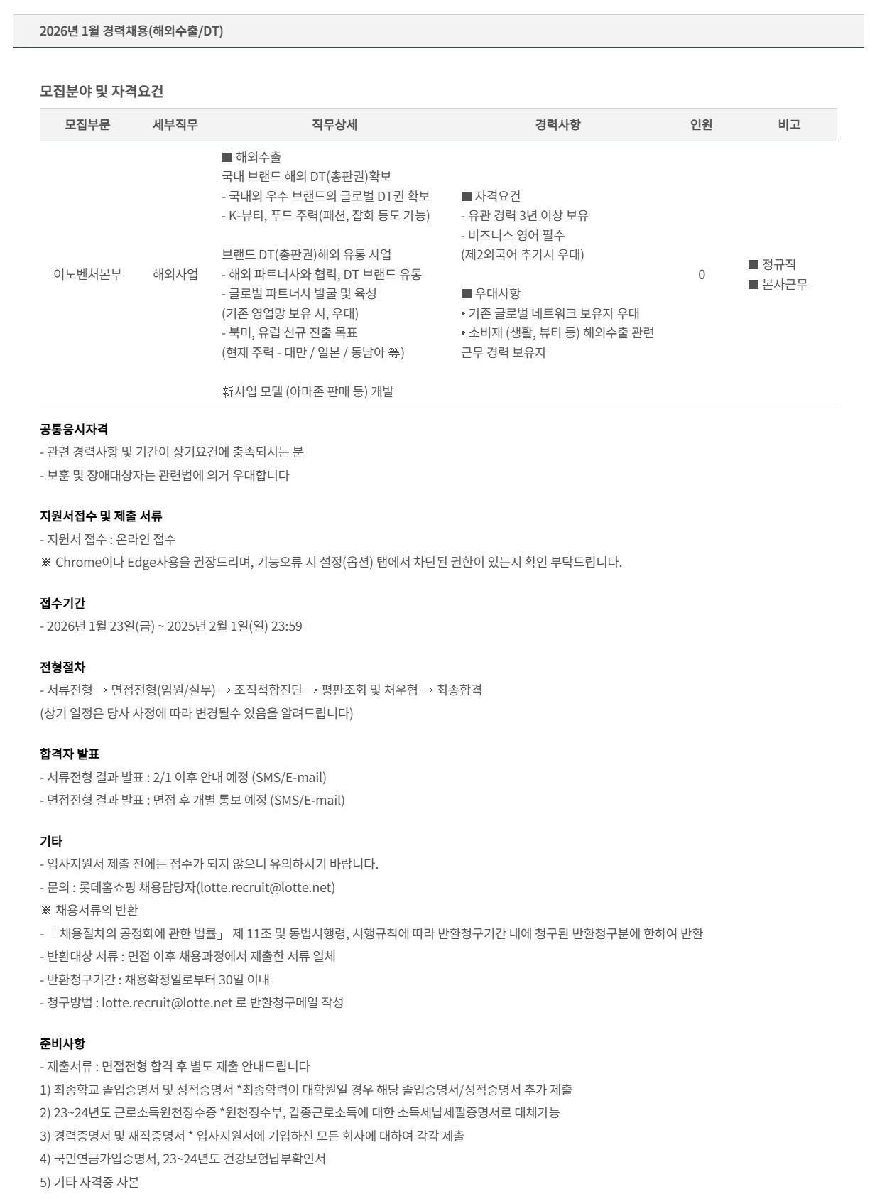 [롯데홈쇼핑] 2026년 1월 경력채용 (해외수출/DT)