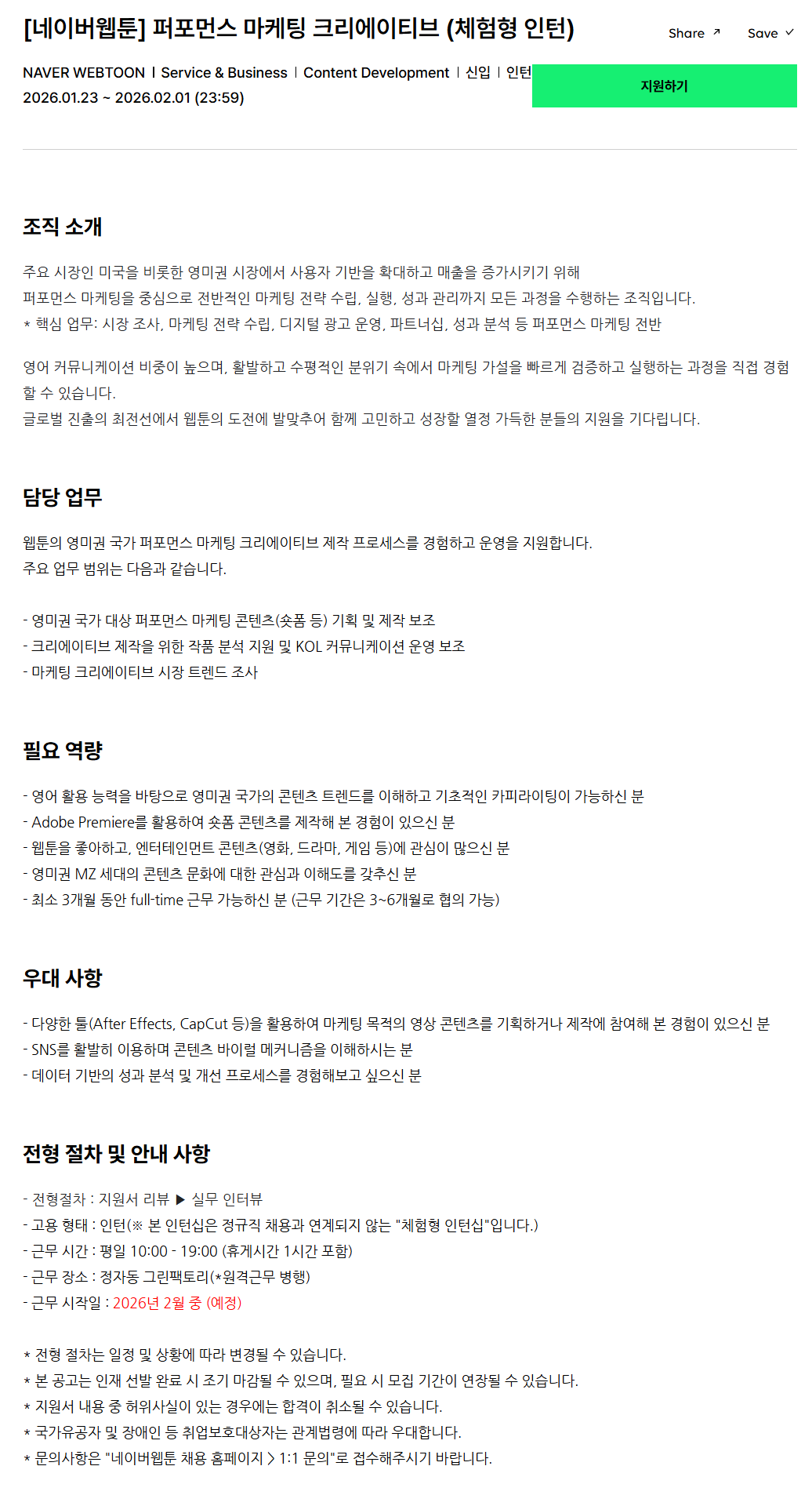 [네이버웹툰] 퍼포먼스 마케팅 크리에이티브 (체험형 인턴)