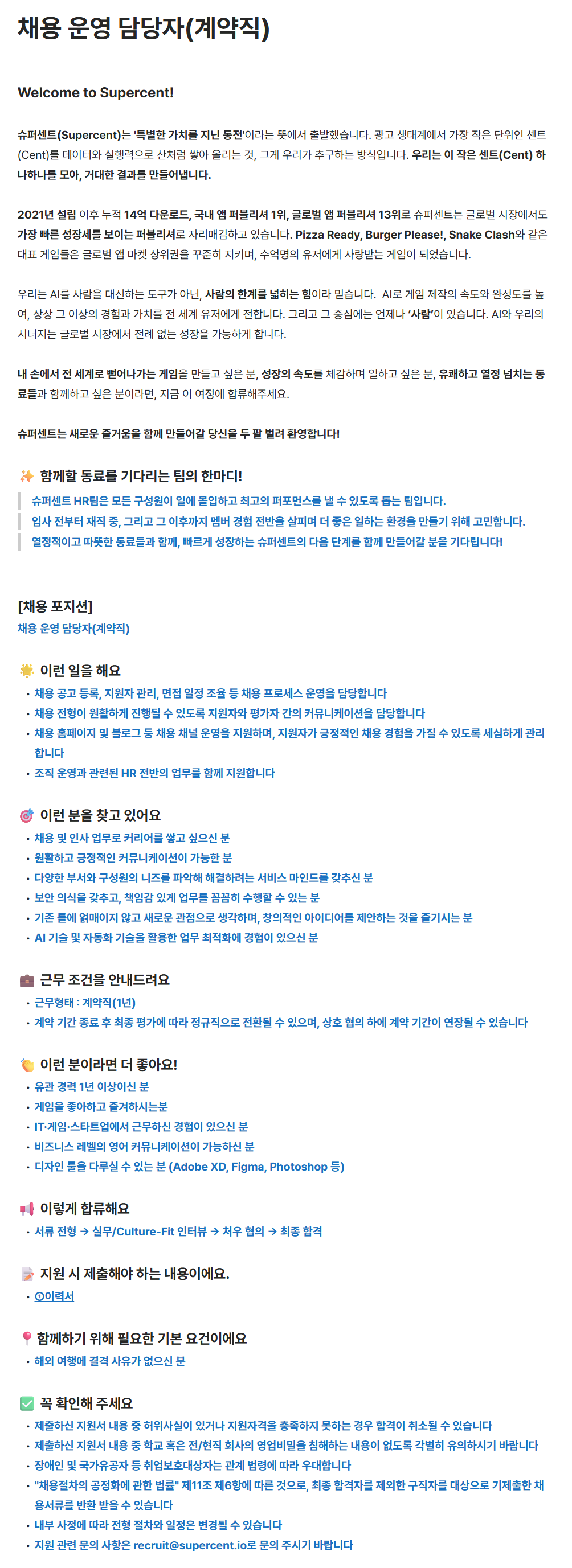 [슈퍼센트] 채용 운영 담당자 (계약직)