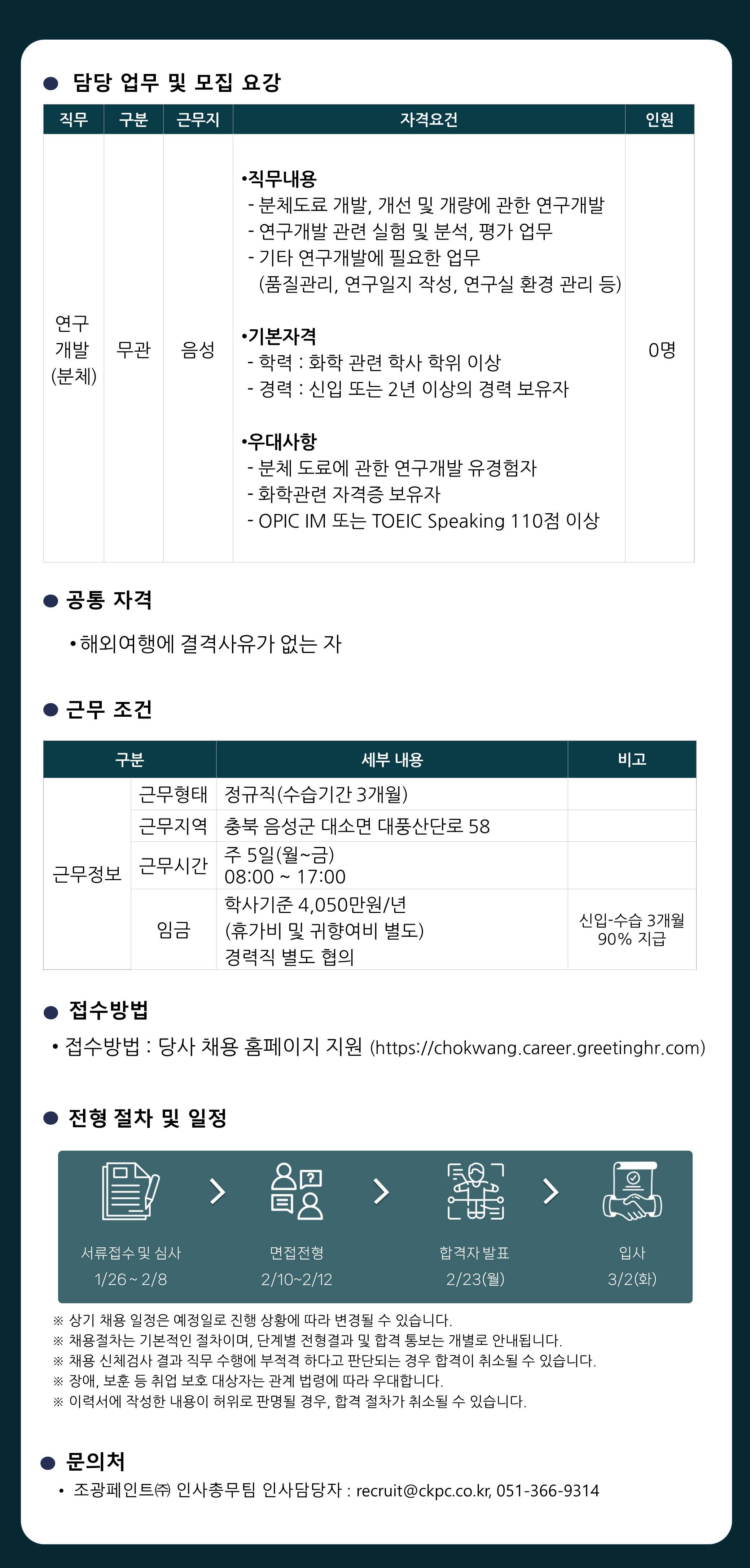 - 분체 도료에 관한 연구개발 유경험자 - 화학관련 자격증 보유자 - OPIc IM 또는 TOEIC Speaking 110점 이상