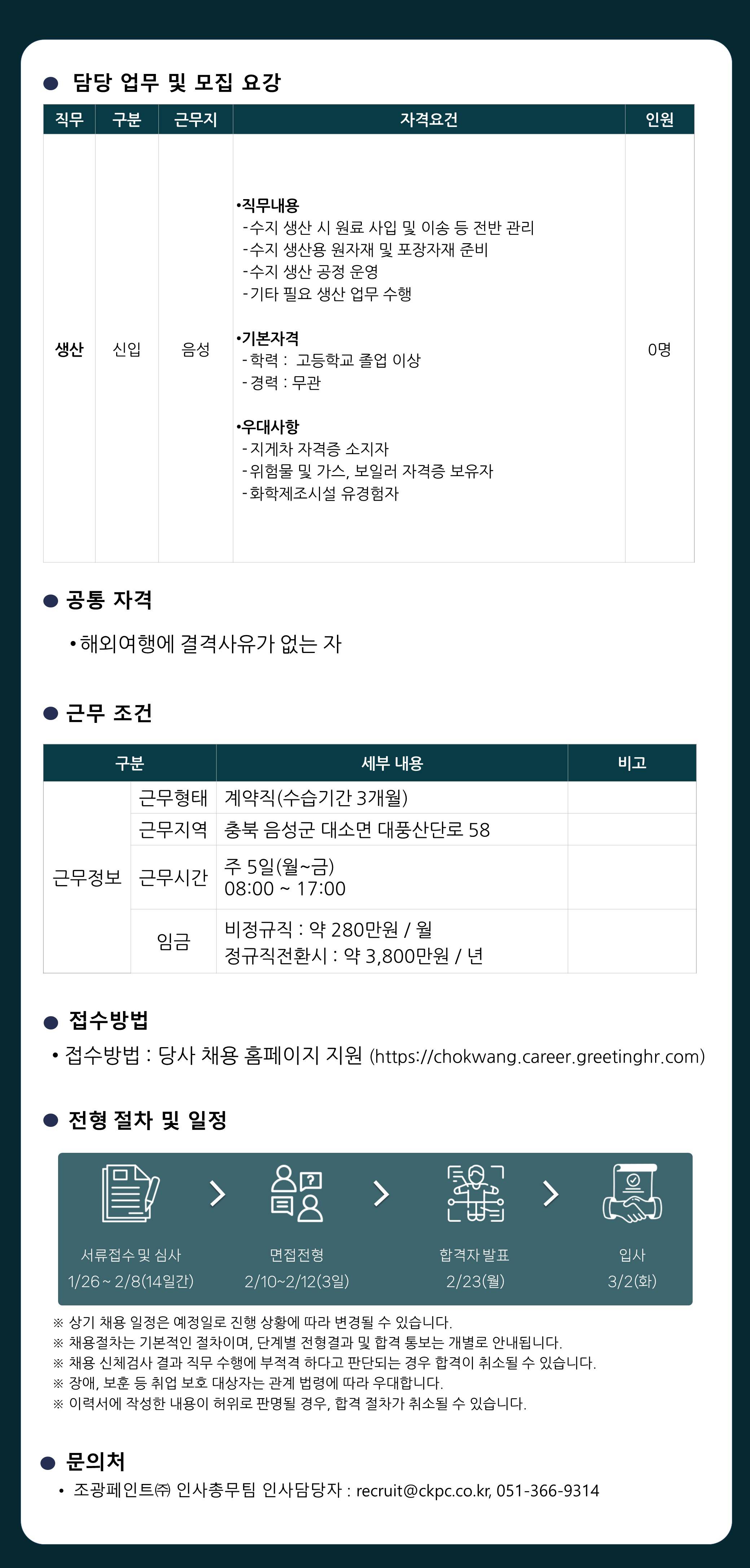 - 지게차 자격증 소지자 - 위험물 및 가스, 보일러 자격증 보유자 - 화학제조시설 유경력자
