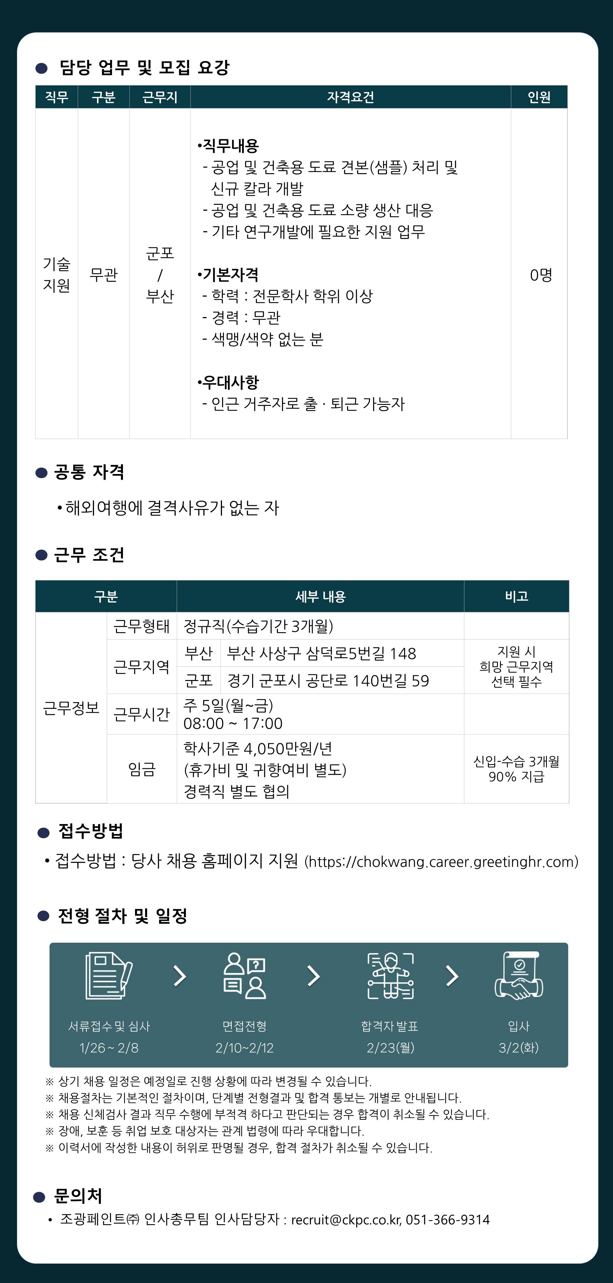- 전문학사 학위 이상 보유자 - 색맹/색약이 없는 분 (조색 업무 필수 요건) - 신입 및 경력 무관