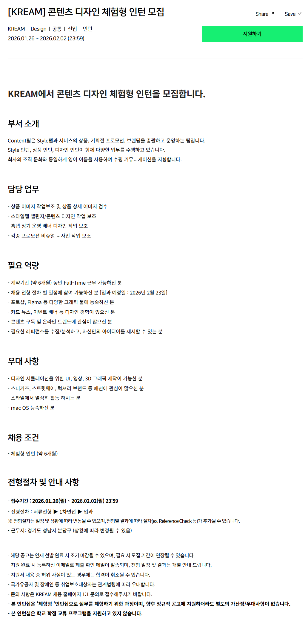 [크림(KREAM)] 콘텐츠 디자인 체험형 인턴 모집