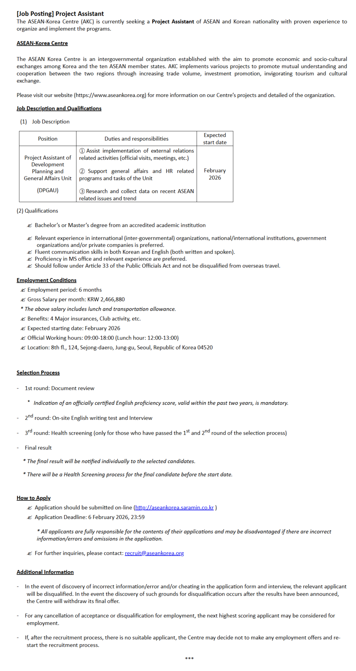 1. Please describe what made you decide to apply for this position, why we should hire you, and what you can contribute to the ASEAN-Korea Centre.(지원동기와 지원한 직무를 본인이 잘 수행할 수 있다고 생각하는 이유는 무엇입니까)*국/영문가능