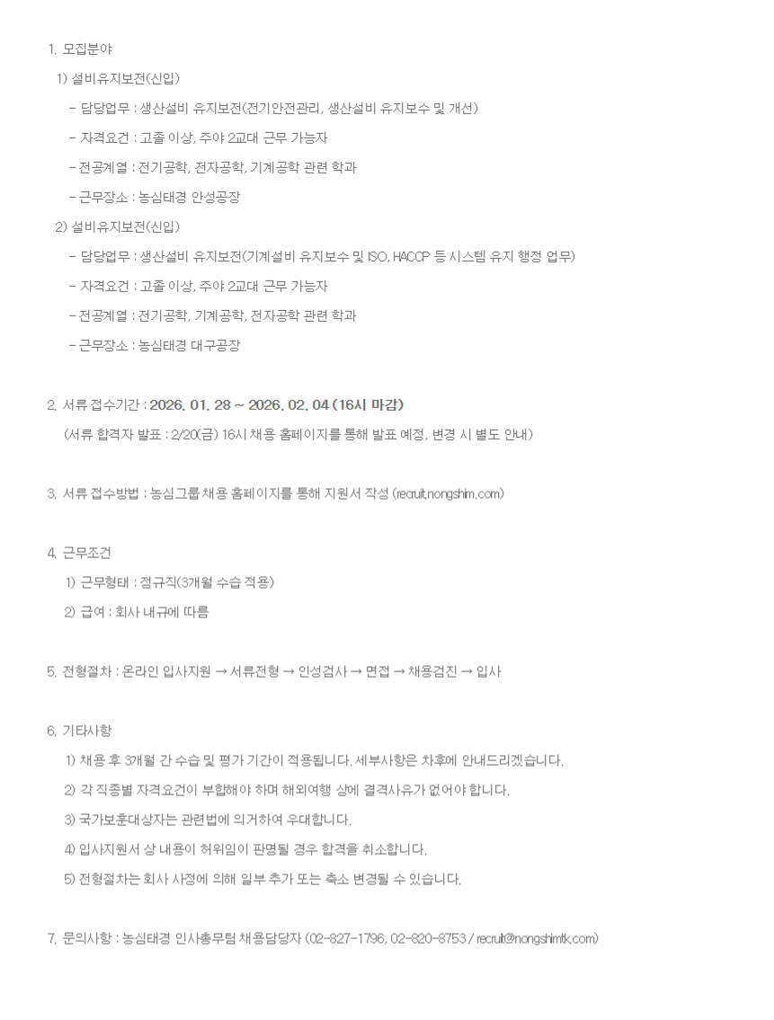 [농심태경] 공무직 신입사원 채용(안성/대구)