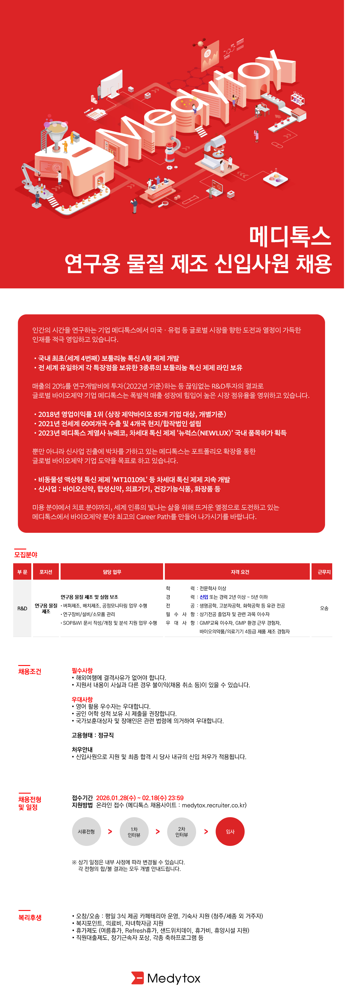 [메디톡스] 연구용 물질 제조 신입/경력사원 채용