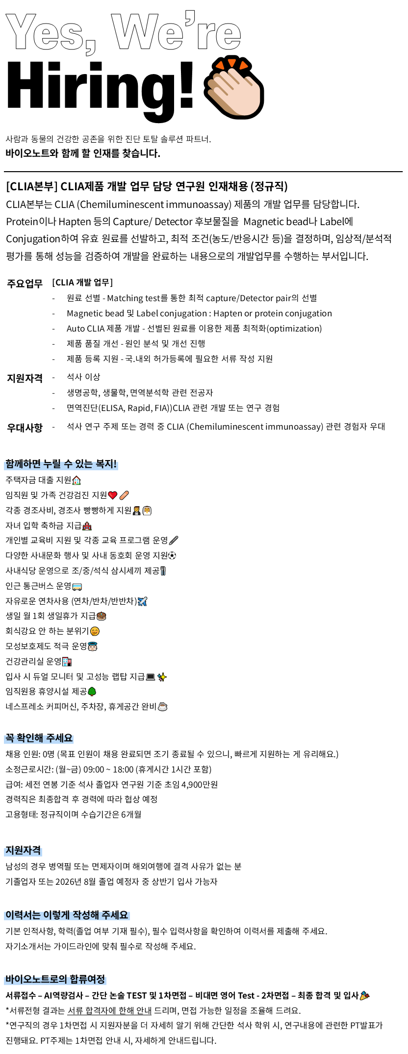 [바이오노트] [정규직/경력무관] CLIA연구개발 연구원 인재채용_2월