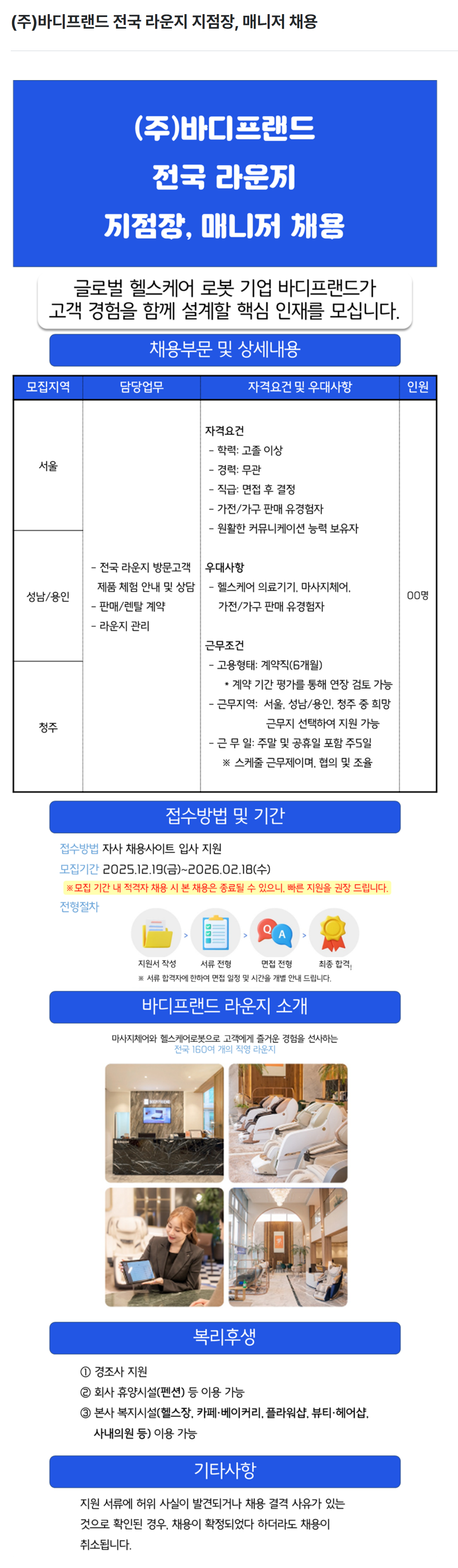 [바디프랜드] 전국 라운지 지점장, 매니저 채용