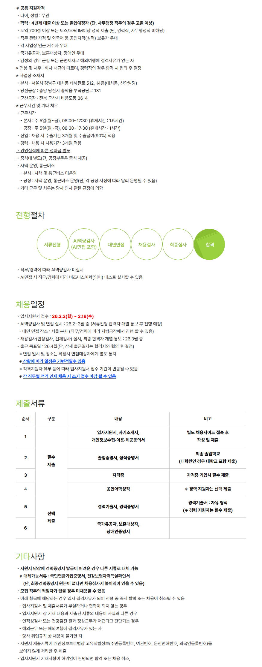 전형절차 : 서류전형 > AI역량검사(AI면접 포함) > 대면면접 > 채용검사 > 최종심사 > 최종합격