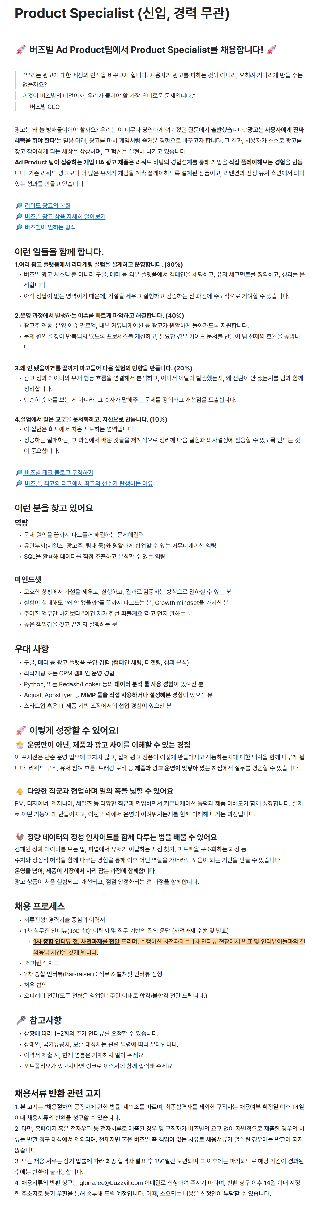 [버즈빌] Product Specialist (신입, 경력 무관)