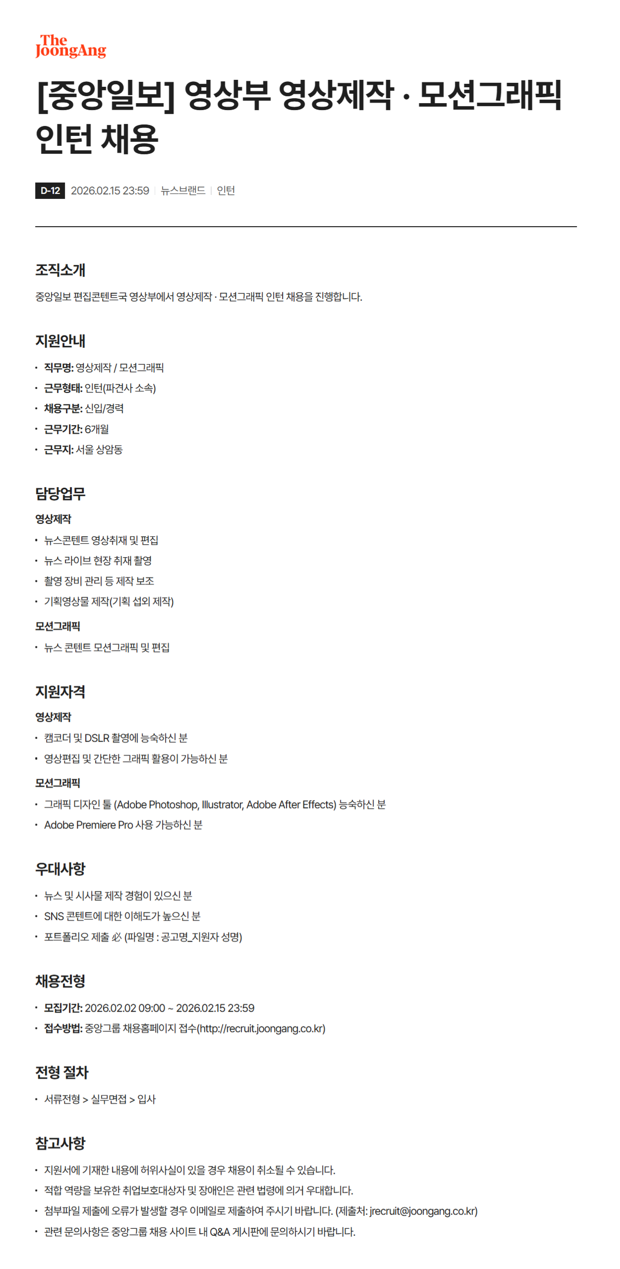 [중앙일보] 영상부 영상제작 · 모션그래픽 인턴 채용