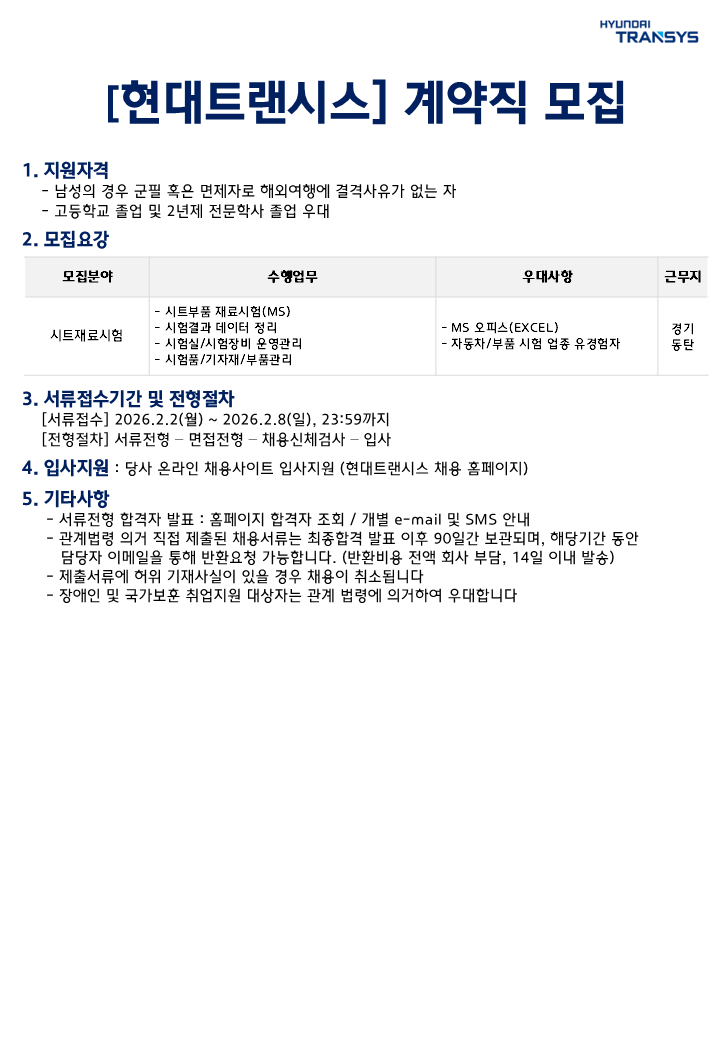 [현대트랜시스] 시트재료시험부문 계약직 모집