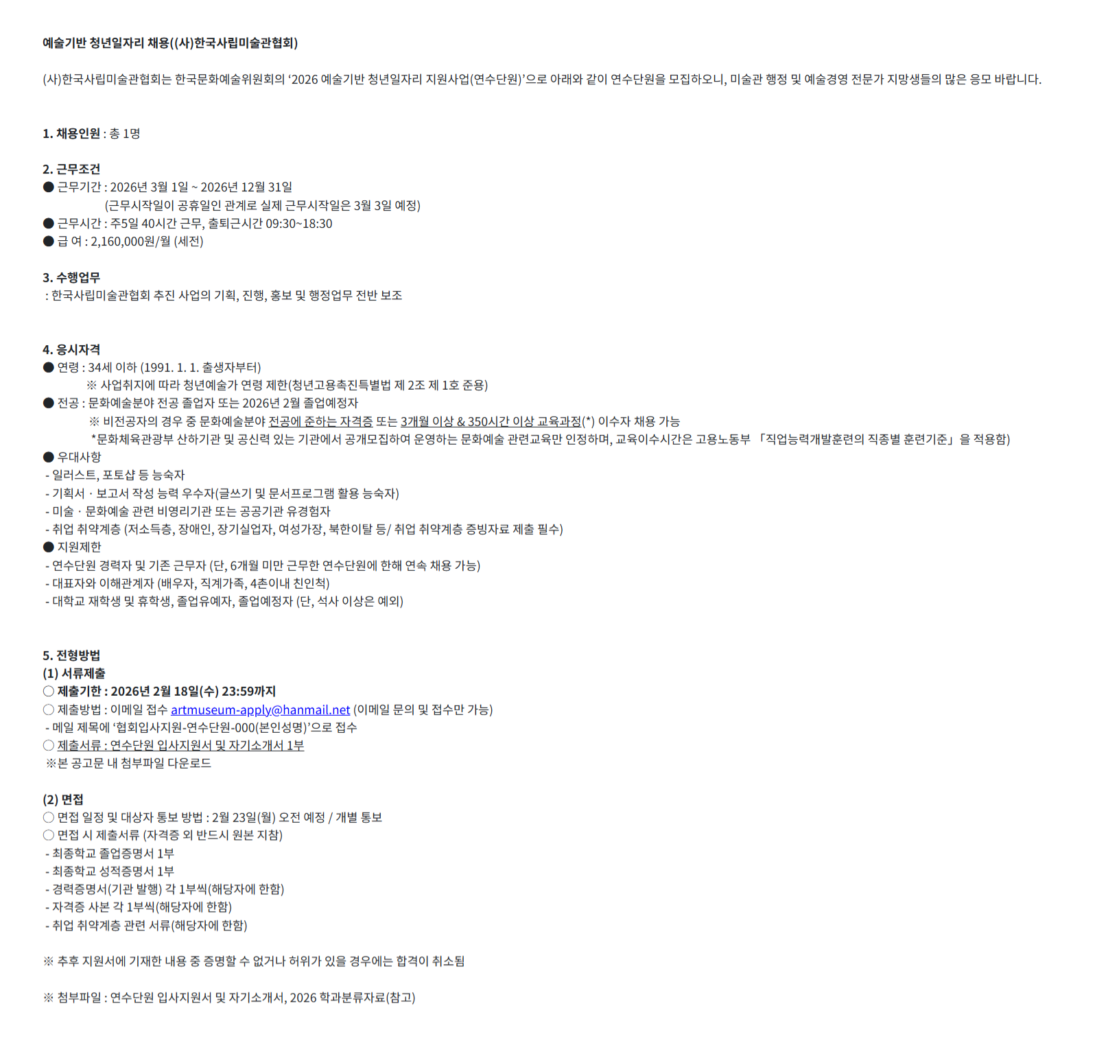 전공 : 문화예술분야 전공 졸업자 또는 2026년 2월 졸업예정자