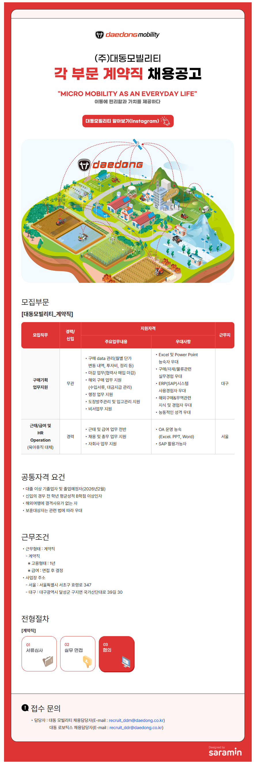 근무지역 : 대구 달성군 구지면 국가산단대로39길 30 (응암리) 대동모빌리티