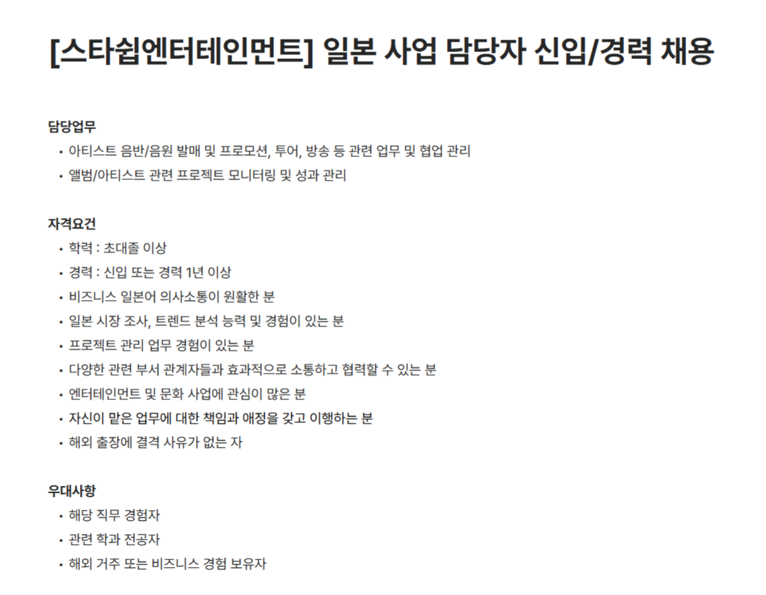 아티스트 음반/음원 발매 및 프로모션, 투어, 방송 등 관련 업무 및 협업 관리