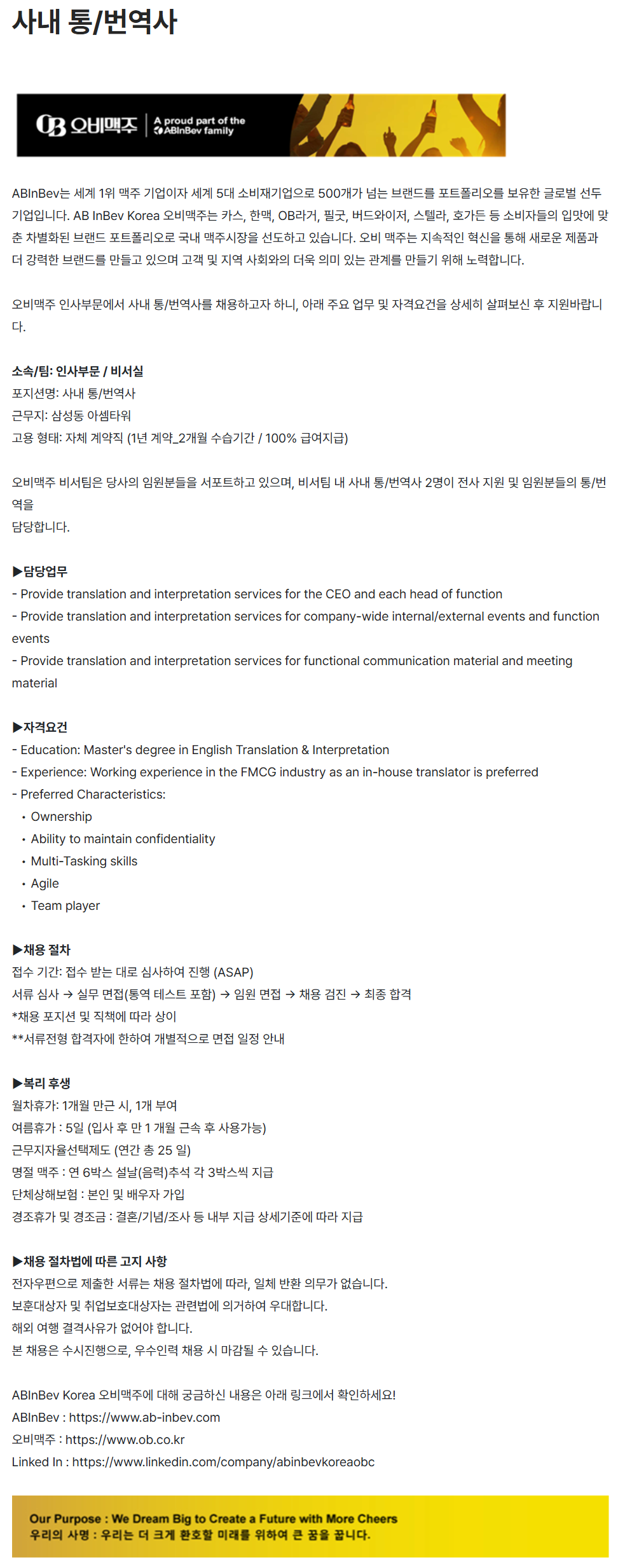 [오비맥주] 사내 통/번역사