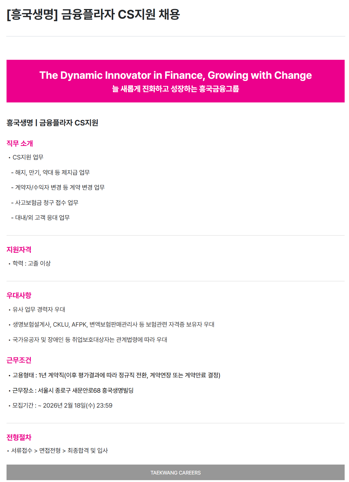 [흥국생명보험] 금융플라자 CS지원 채용