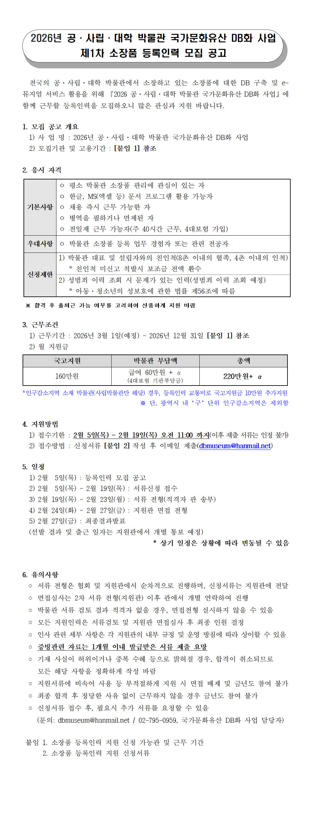 [한국박물관협회] 2026년 공 사립 대학 박물관 국가문화유산 DB화 사업 제1차 소장품 등록인력 채용