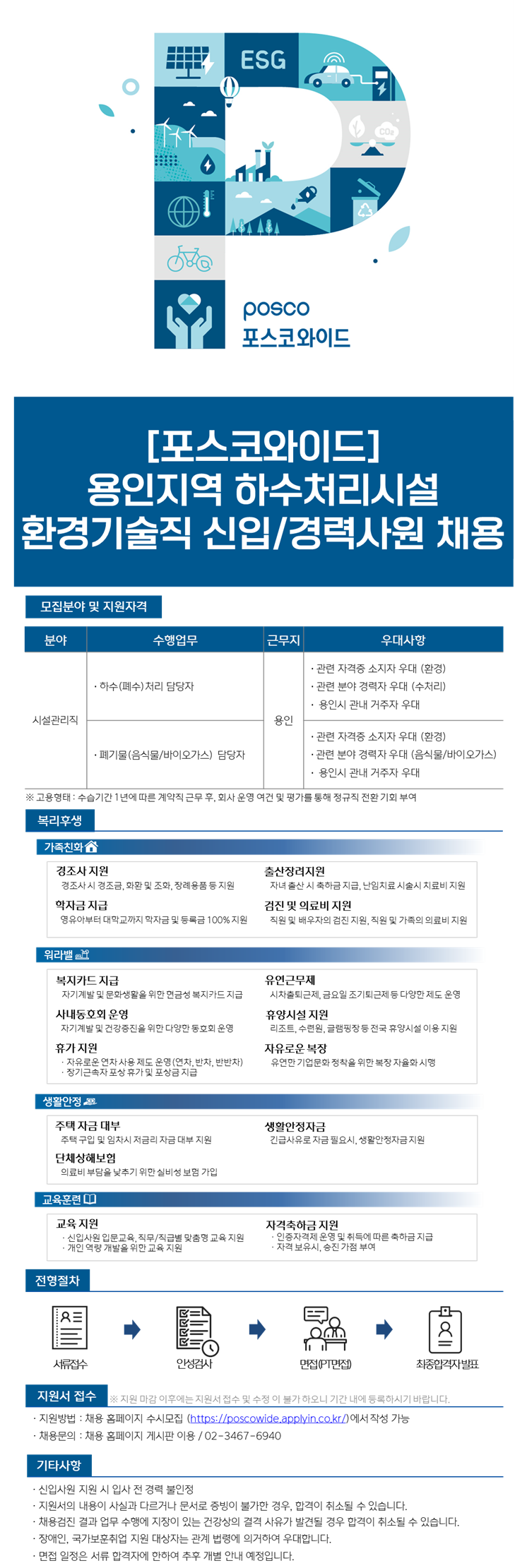 [포스코와이드] 용인지역 하수처리시설 환경기술직 신업/경력사원 채용