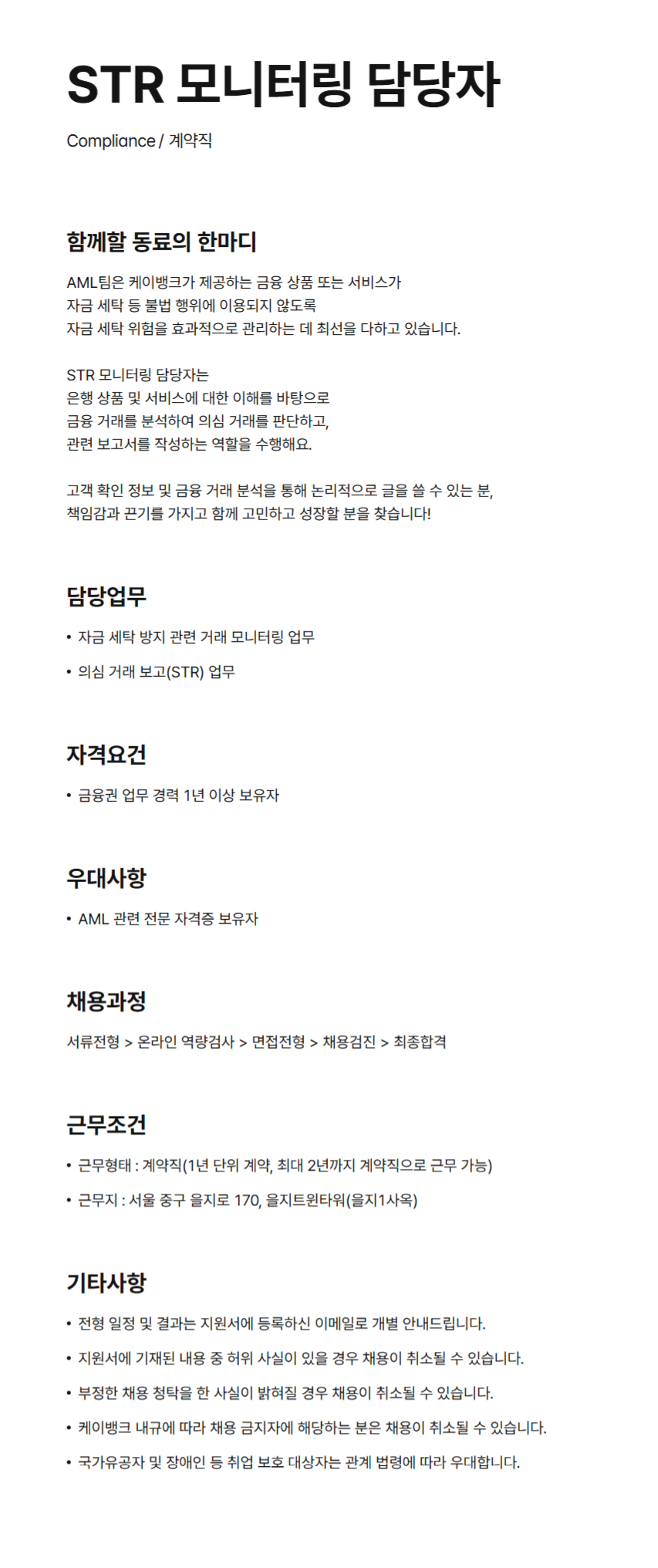 [케이뱅크] STR 모니터링 담당자 채용