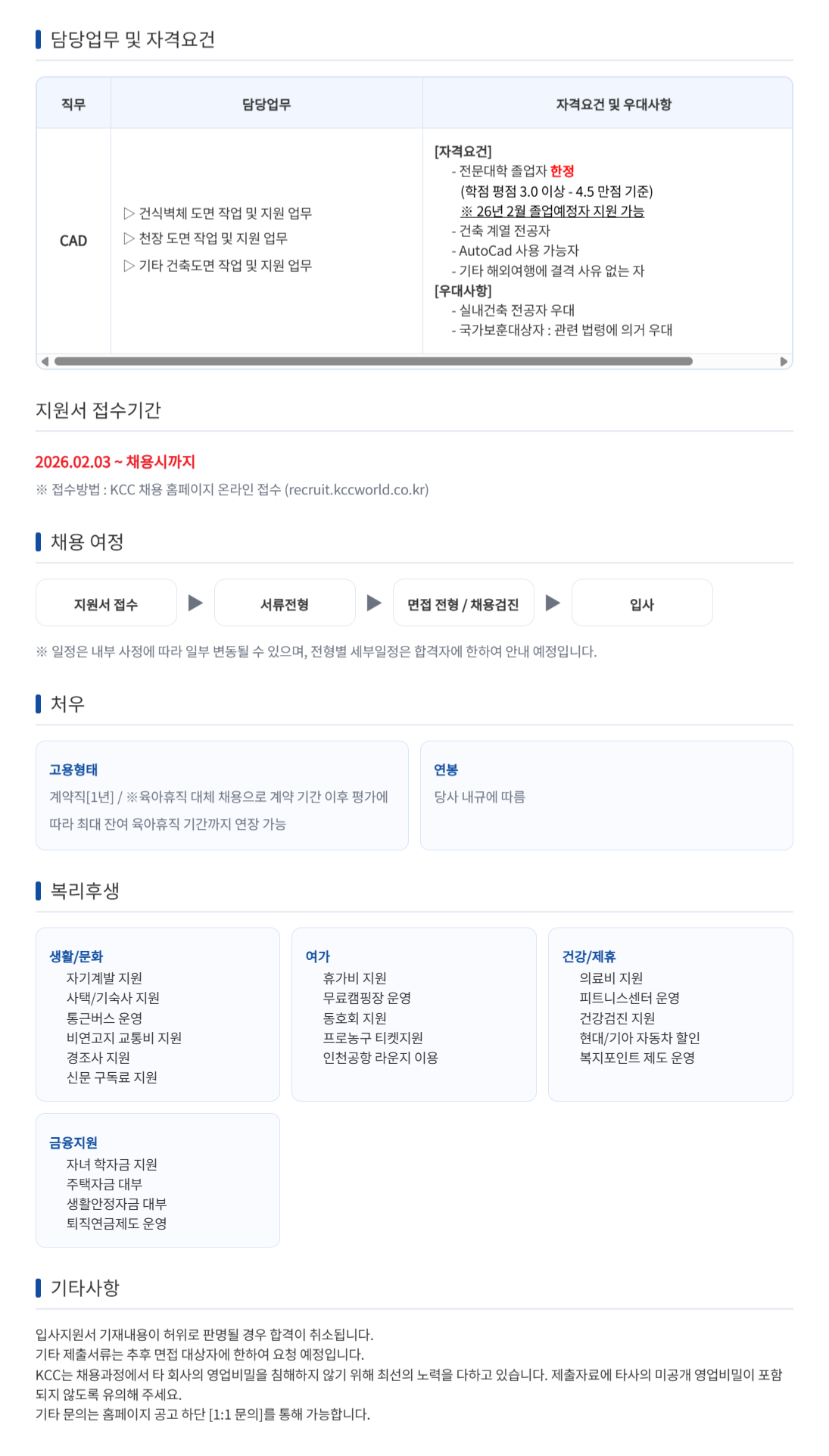 [KCC] 본사 설계판촉팀 CAD 담당 촉탁 채용(전문학사 한정)