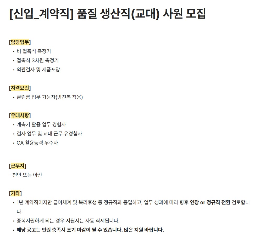 [하나머티리얼즈] [신입_계약직] 품질 생산직(교대) 사원 모집