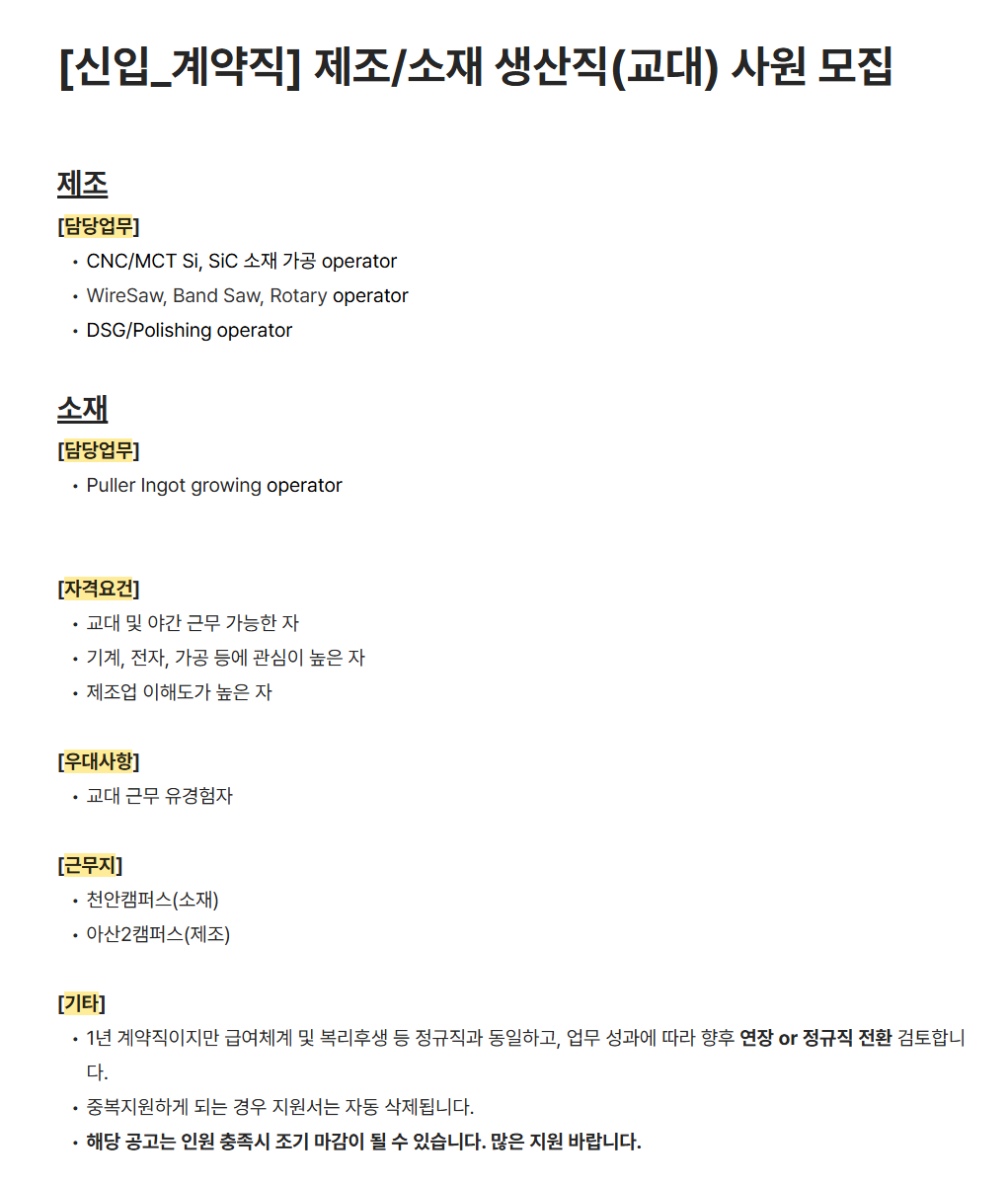 [하나머티리얼즈] [신입_계약직] 제조/소재 생산직(교대) 사원 모집