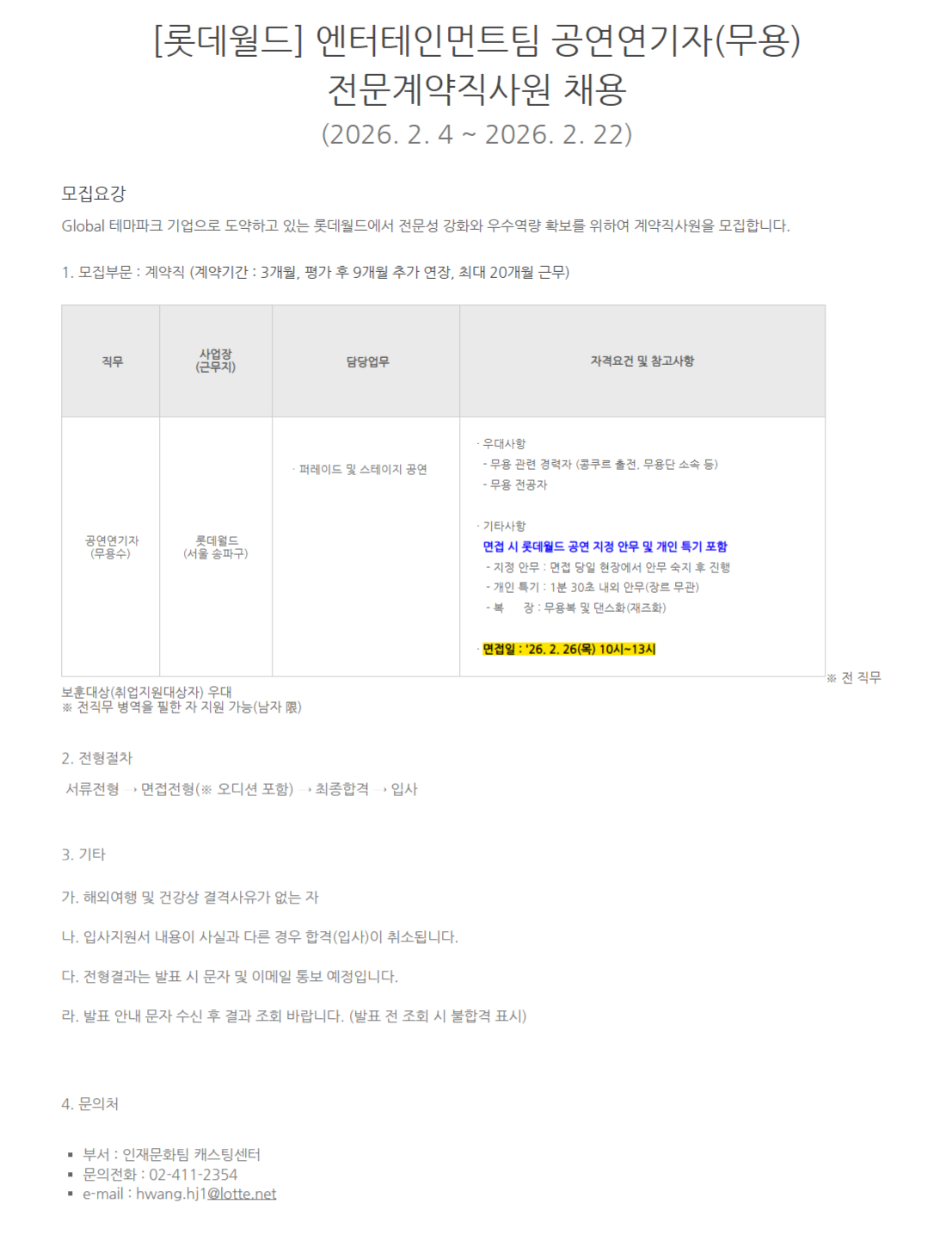 [롯데월드] [26.2월][전문계약직] 엔터테인먼트팀 공연연기자(캐릭터/무용) 전문계약직사원 채용
