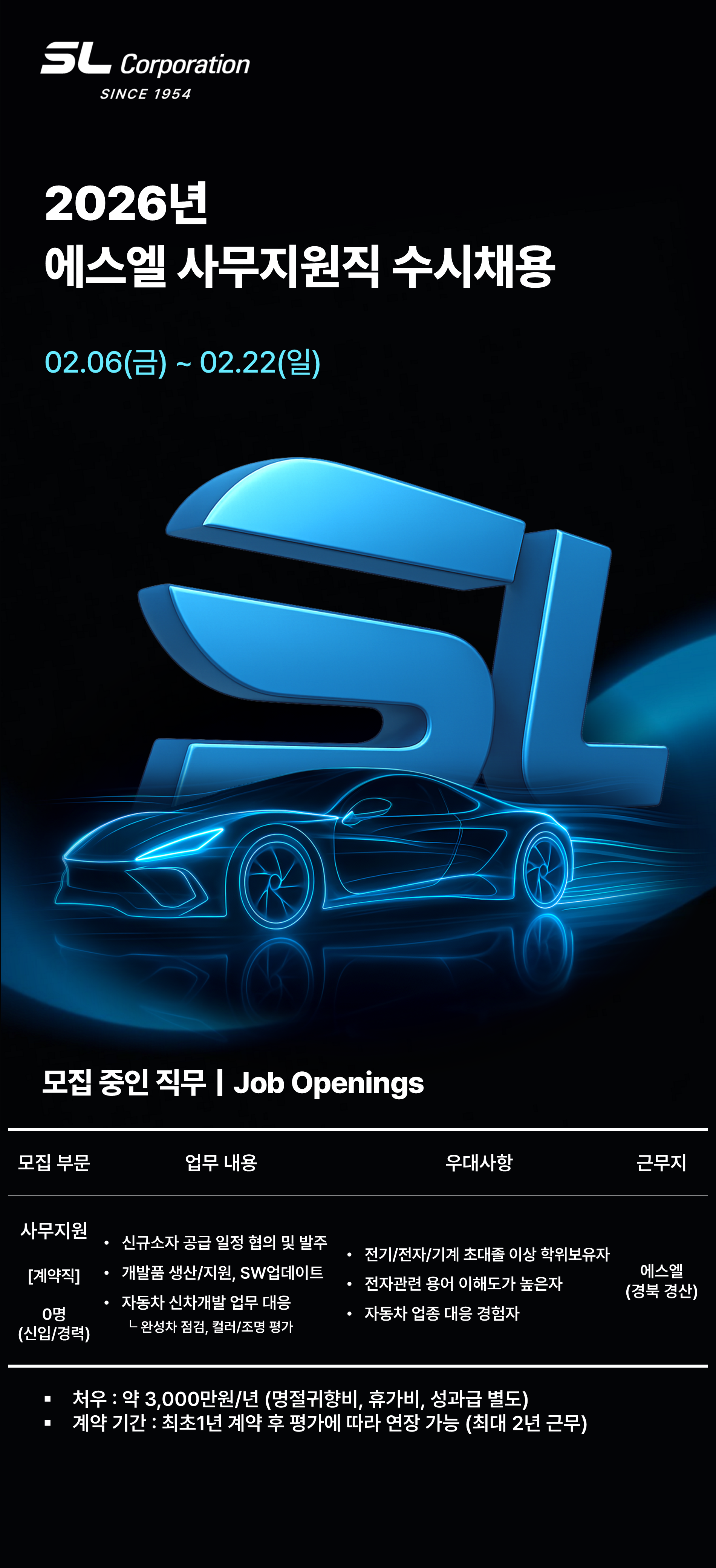 [에스엘] 2026년 사무지원직 수시채용(신차개발관리팀)