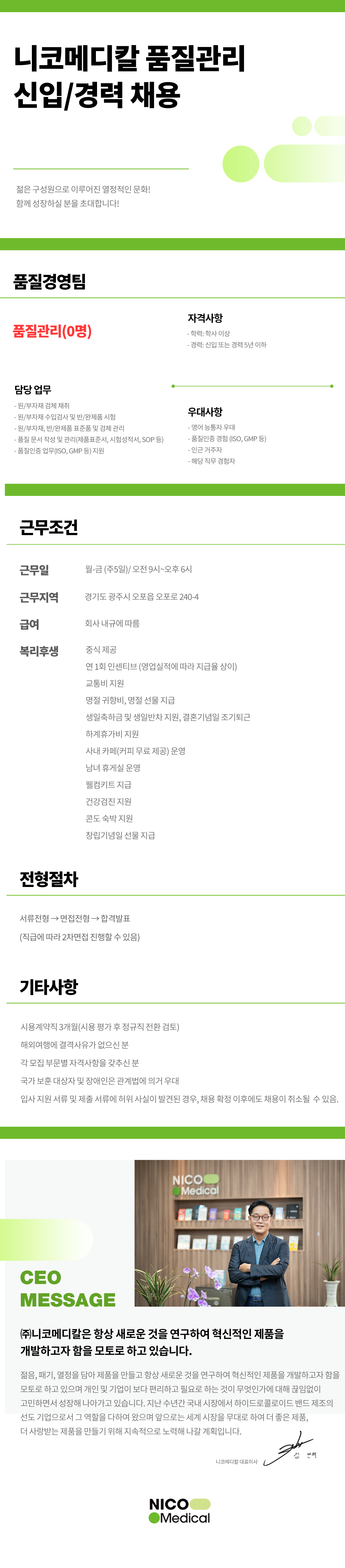 [니코메디칼] 품질경영팀 품질관리 신입/경력 채용
