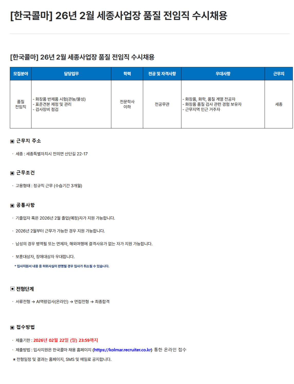 [한국콜마] 26년 2월 세종사업장 품질 전임직 수시채용