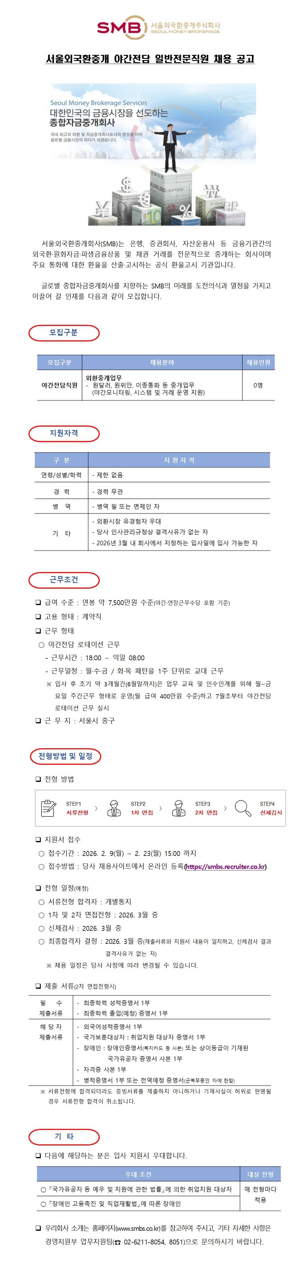 [서울외국환중개] 2026년 야간전담직원 채용(계약직/경력무관)