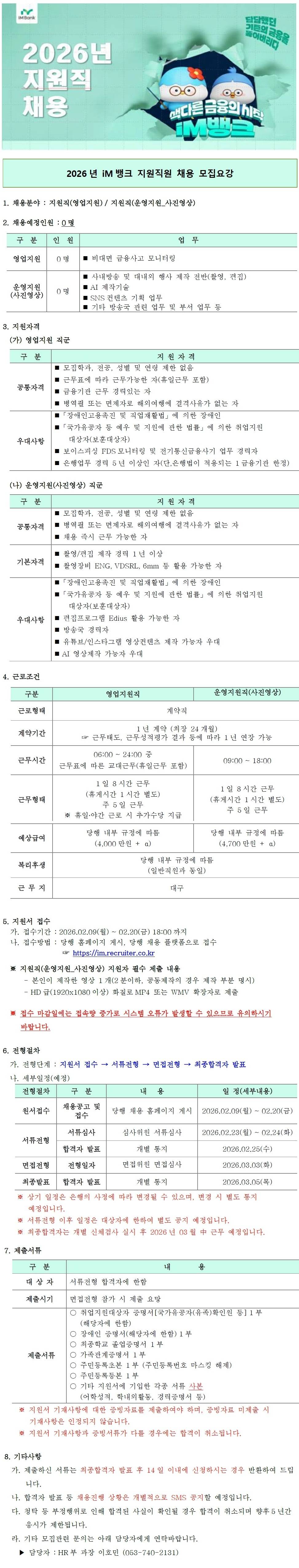 [iM뱅크] 2026년 지원직원(비대면 금융사고 모니터링 및 사진영상) 채용