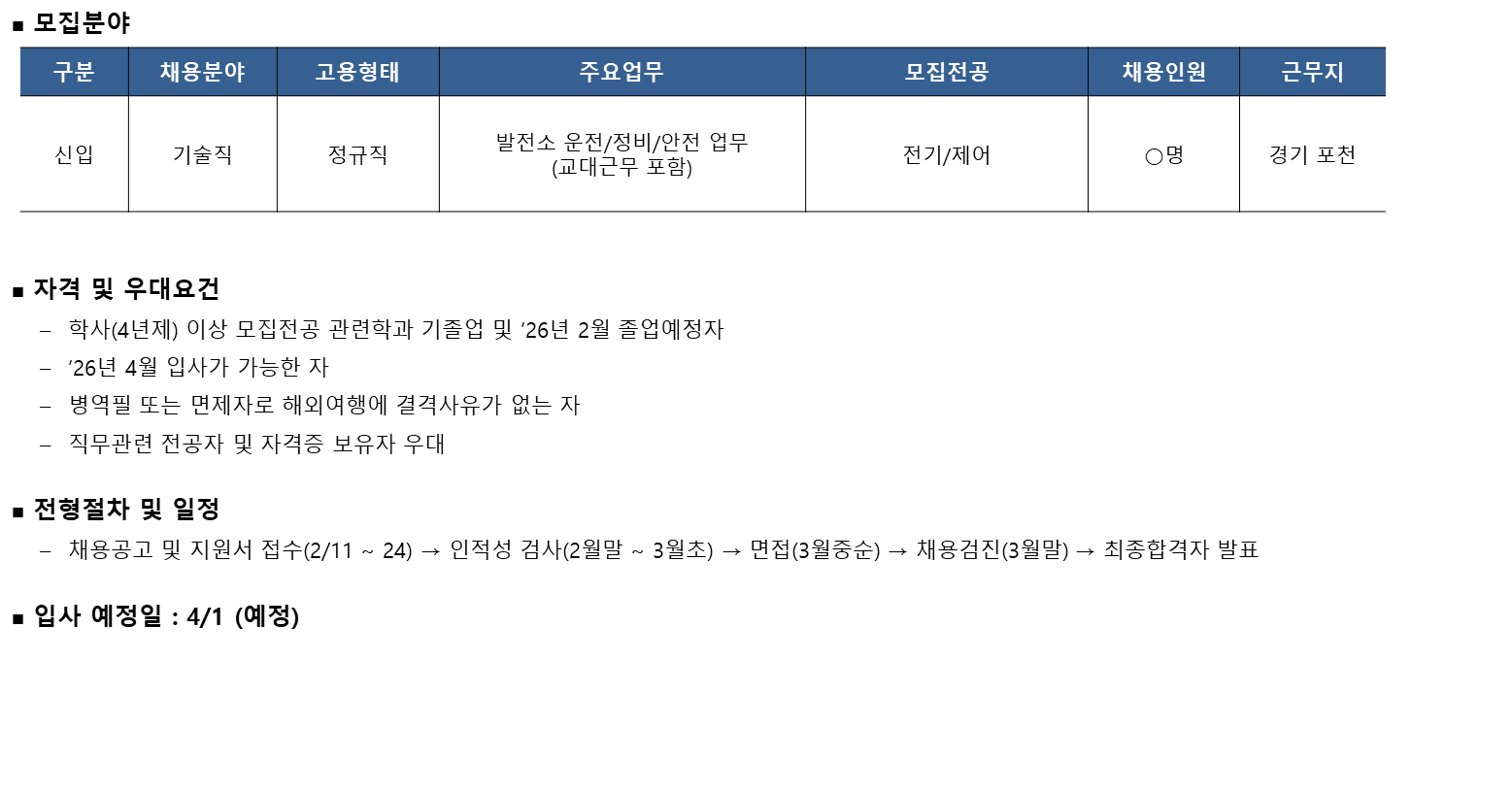 - 발전소 운전/정비/안전 업무 (교대근무 포함)