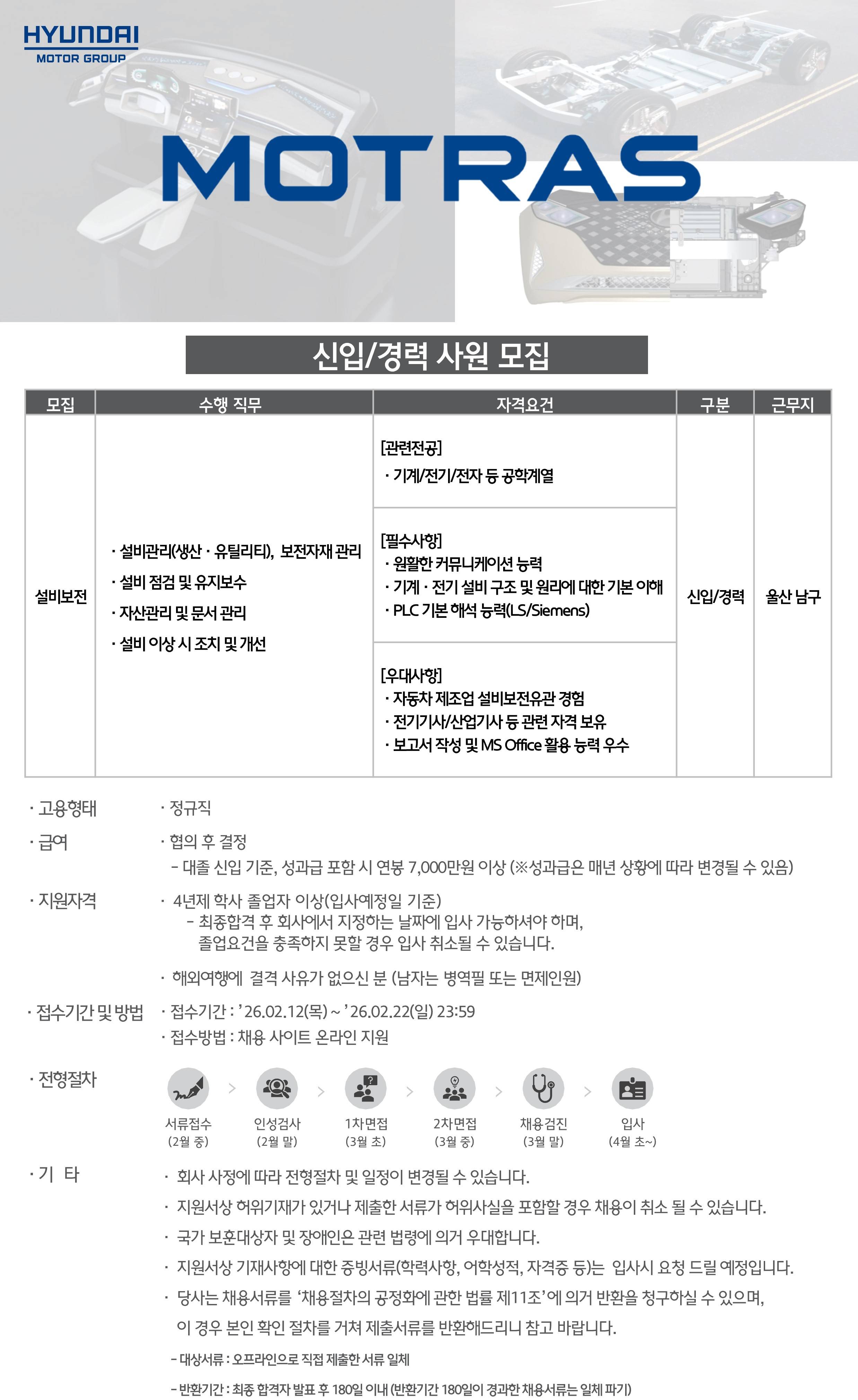 [모트라스] (울산) 설비보전 사무직 신입/경력 채용