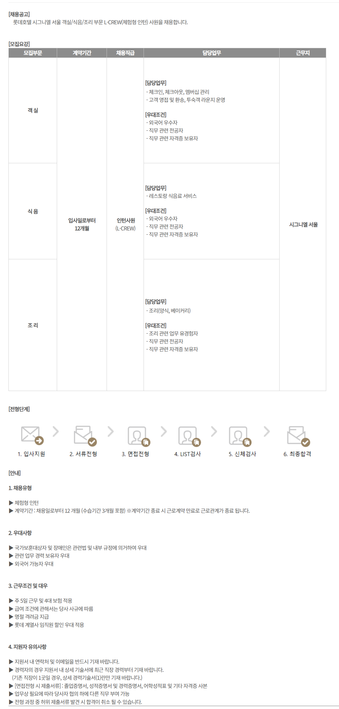 [호텔롯데] 시그니엘 서울 L-CREW(체험형 인턴-객실/식음/조리 부문) 채용 (3월)