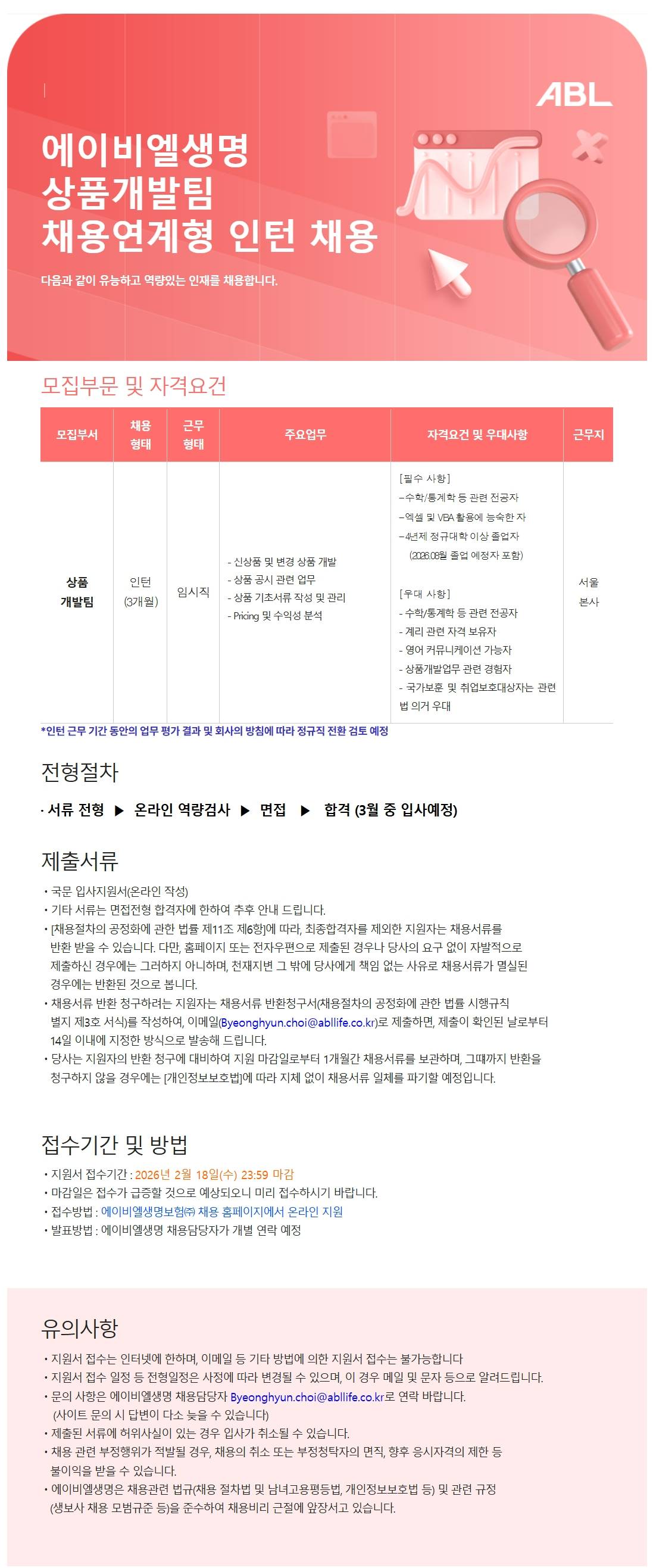 [에이비엘생명보험] 상품개발팀 채용연계형 인턴 채용