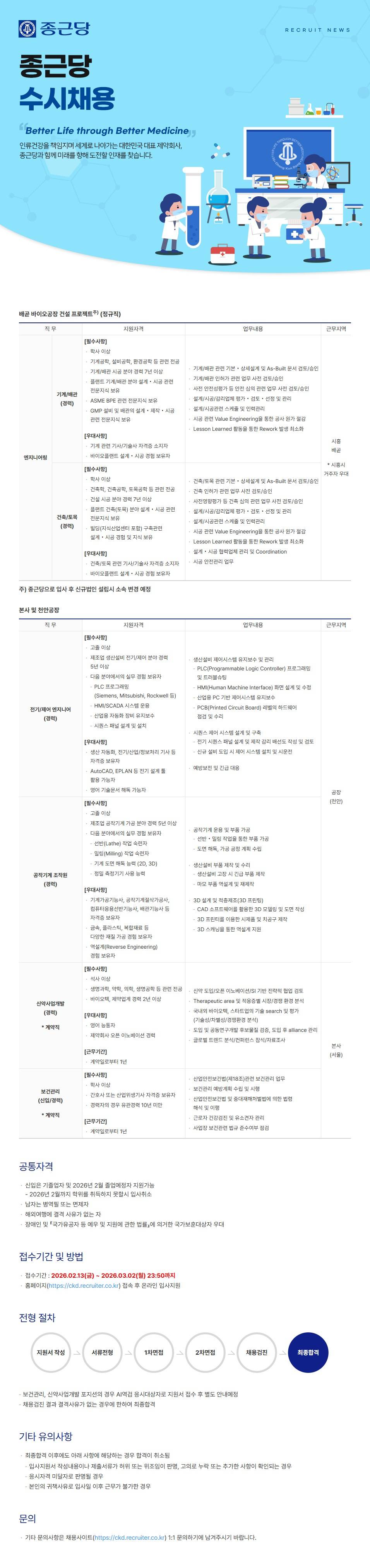 [종근당] 배곧 바이오공장 건설 프로젝트(기계/배관, 건축/토목)https://sempio.recruiter.co.kr/career/jobnotice