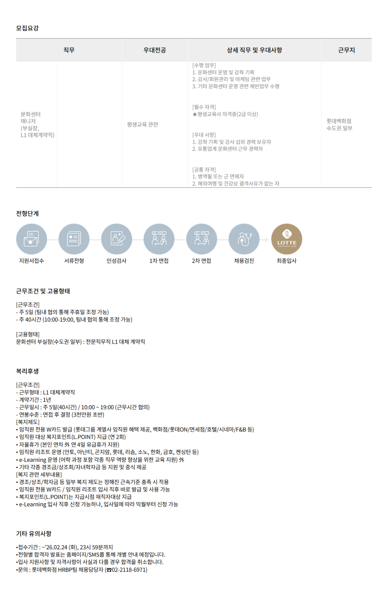 [롯데백화점] 문화센터 매니저 채용 (수도권 일부, 계약직)