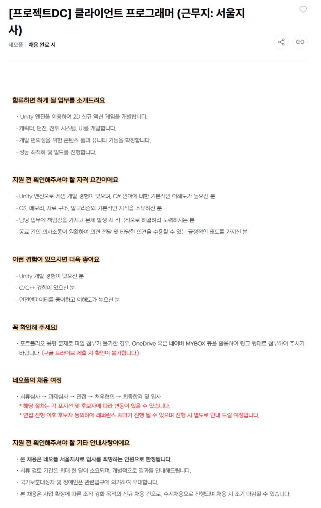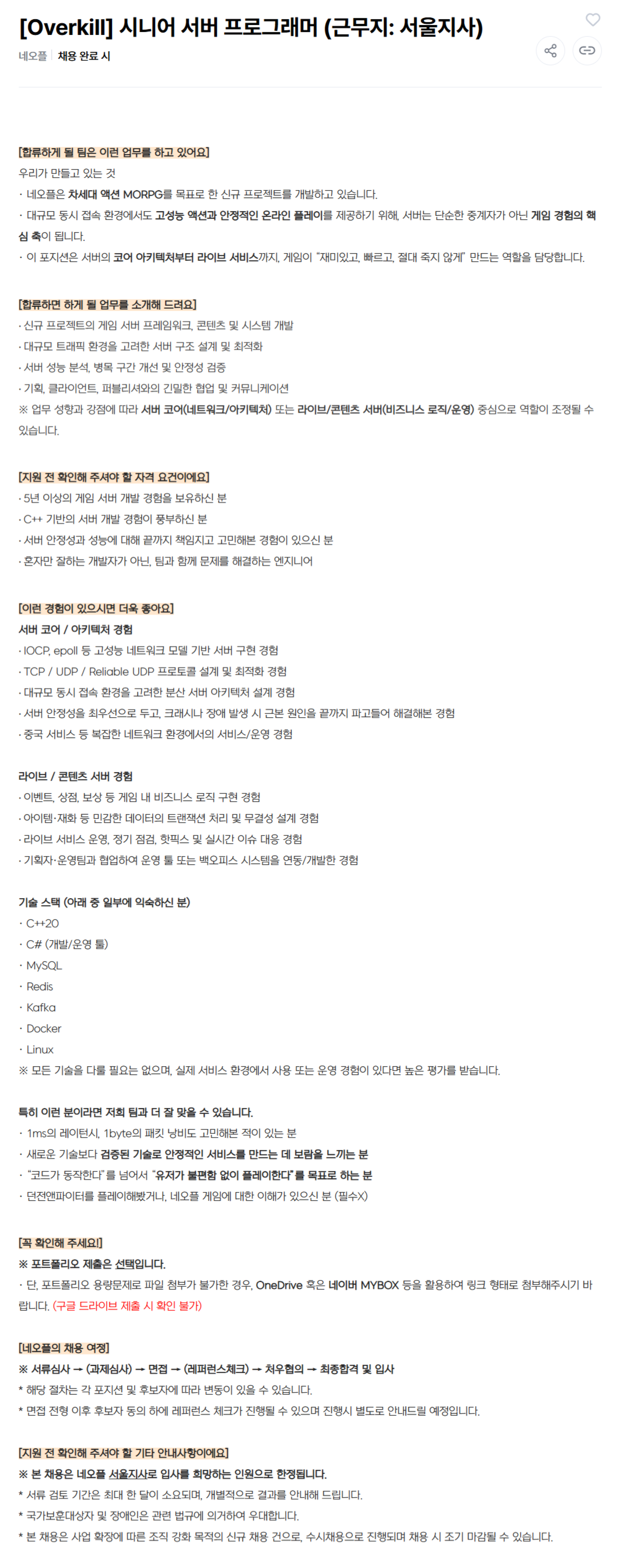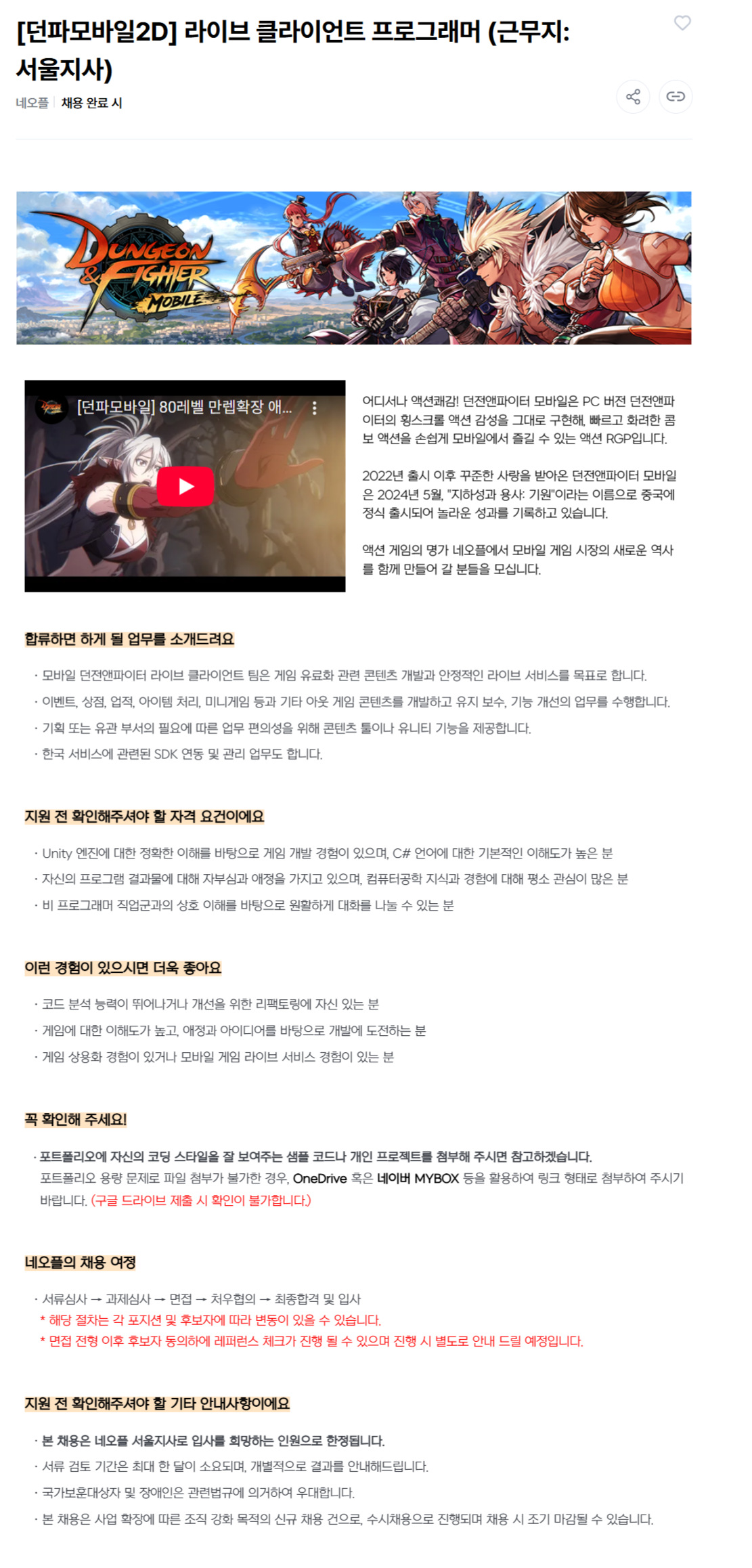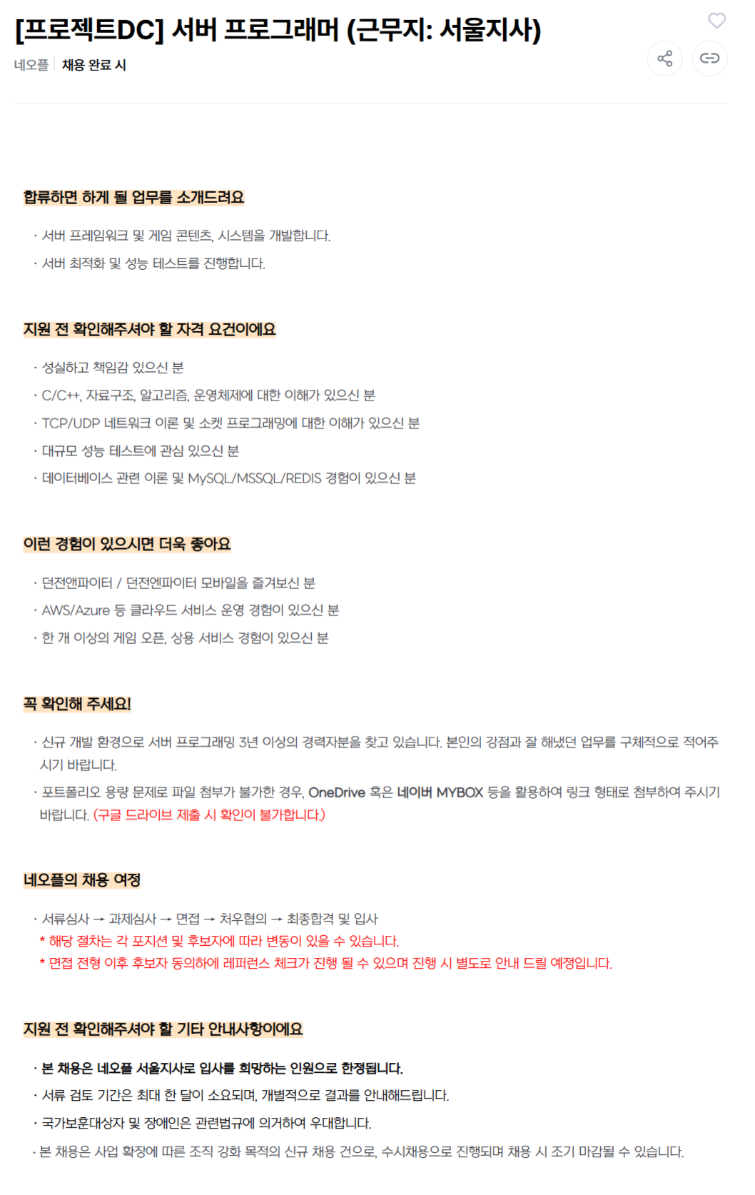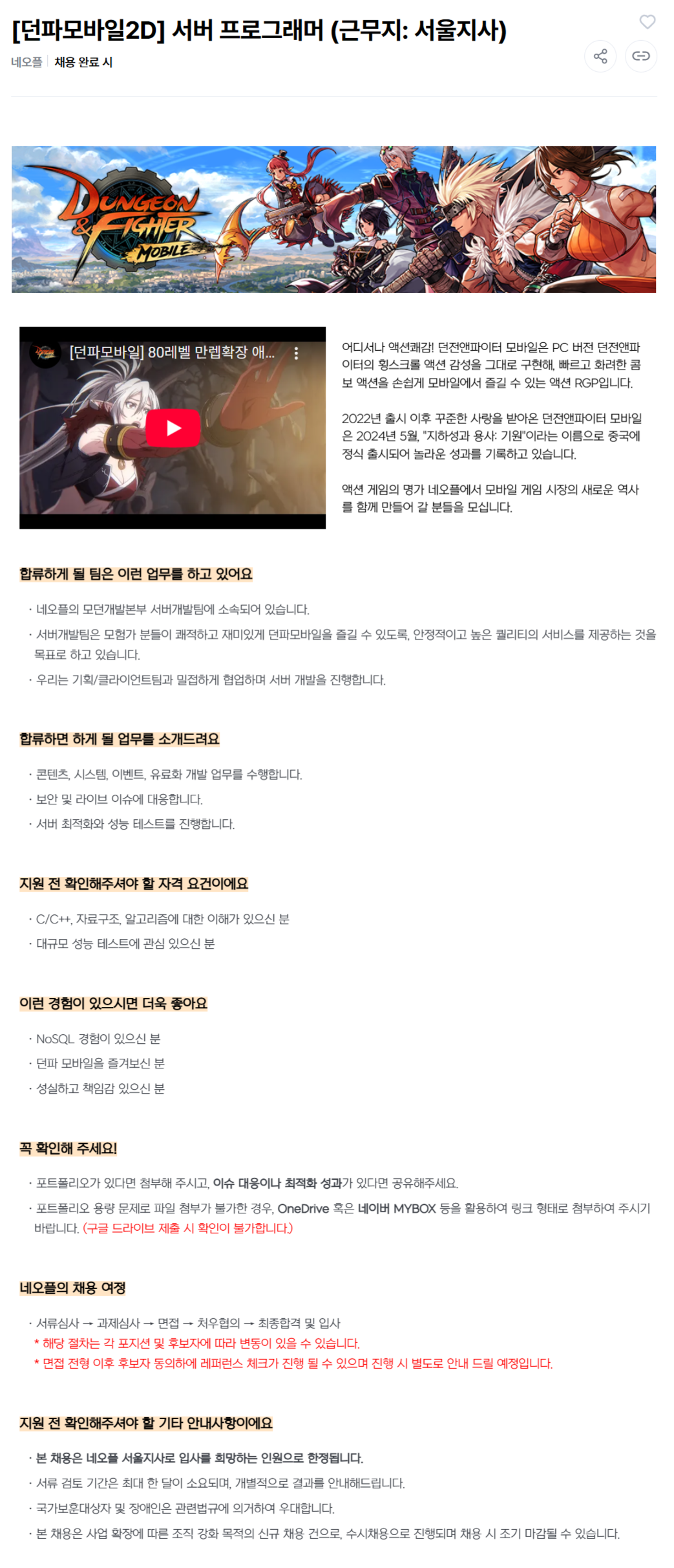 [네오플] 프로그래밍 직군 채용(서울)