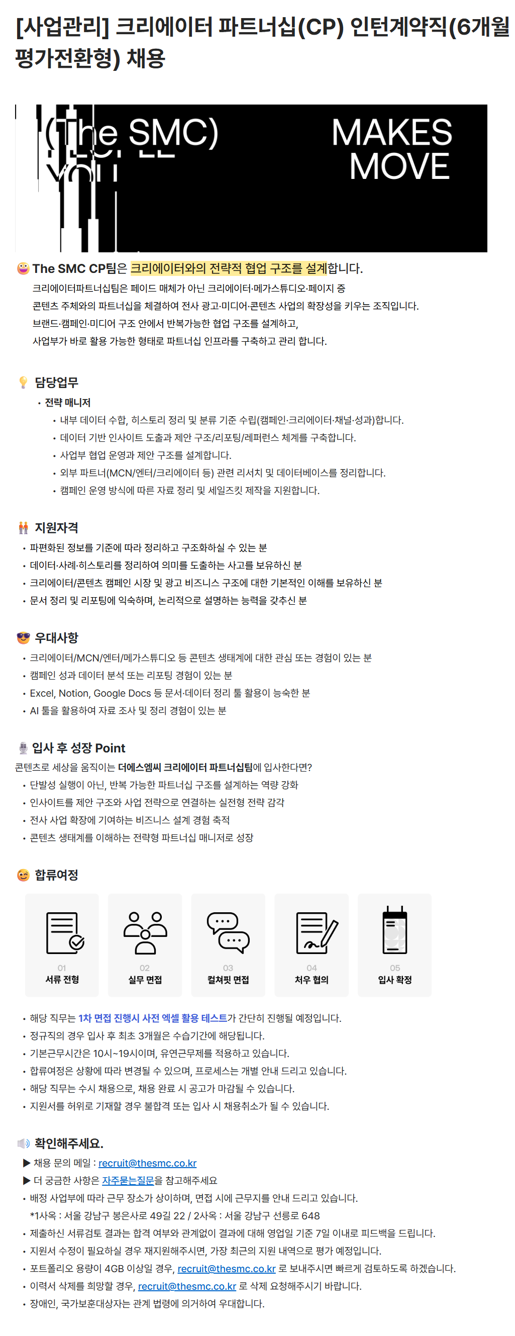 [더에스엠씨] [사업관리] 크리에이터 파트너십(CP) 인턴계약직(6개월 평가전환형) 채용