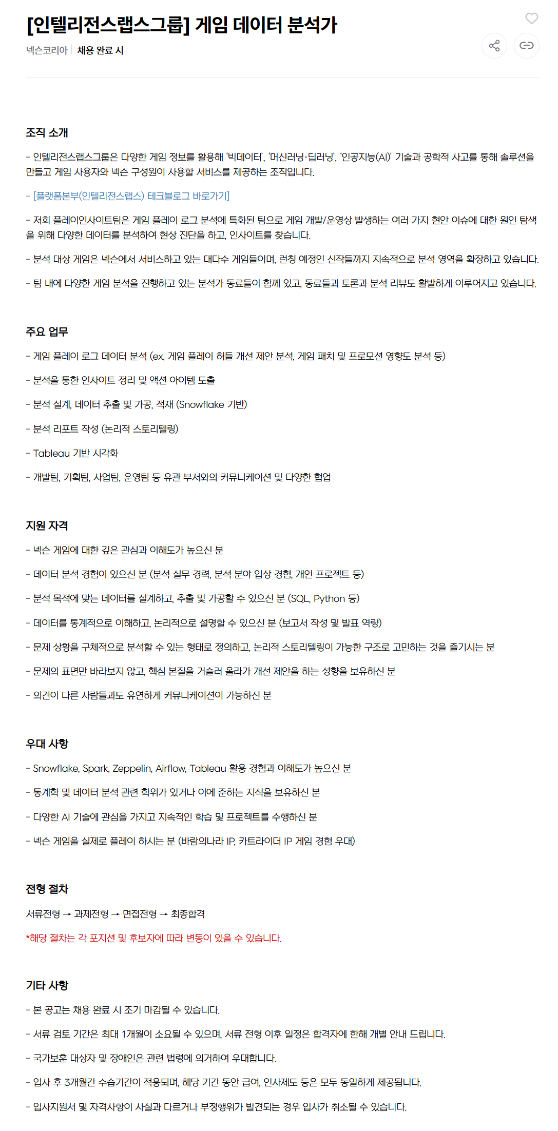 [넥슨코리아] [인텔리전스랩스그룹] 게임 데이터 분석가