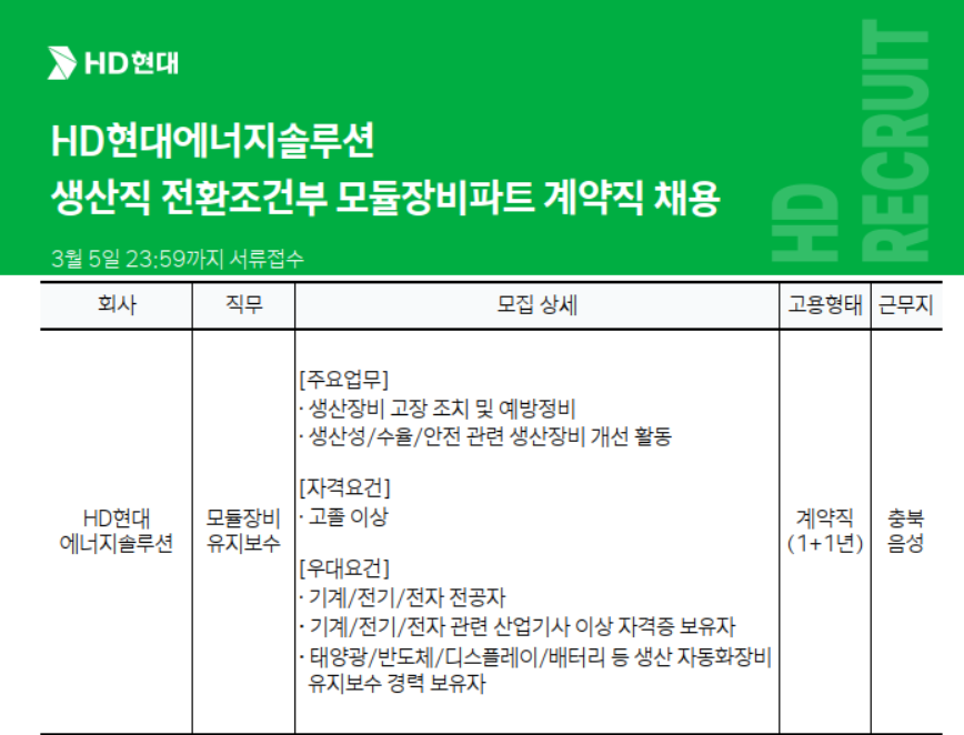 [HD현대에너지솔루션] 생산직 전환조건부 모듈장비파트 계약직 채용